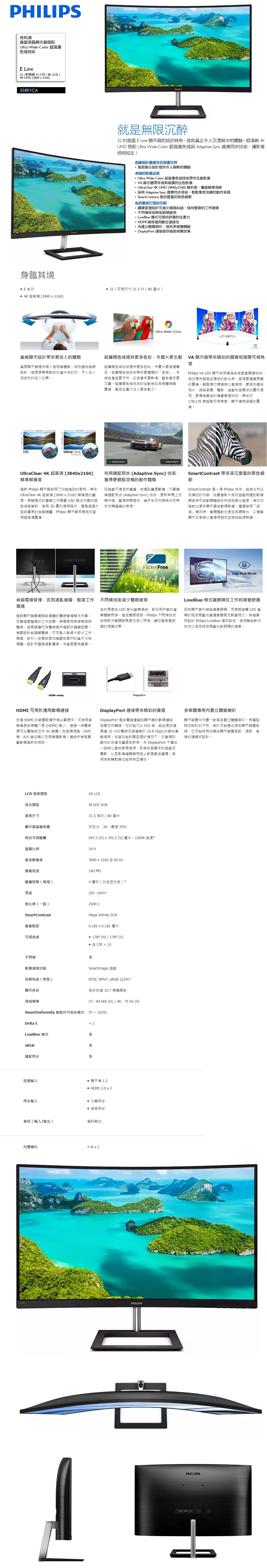 PHILIPS 328E1CA(2H1P/4ms/VA曲面/無喇叭/Adaptive-Sync) 廣色域
