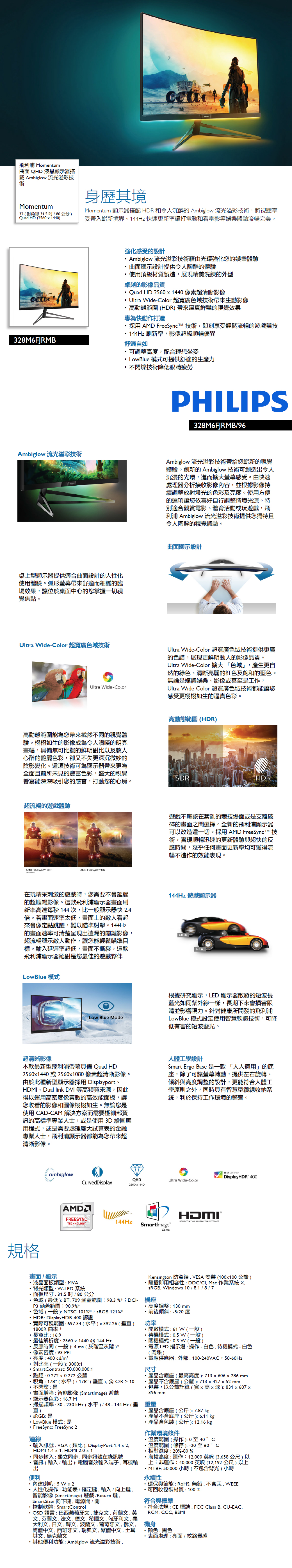 PHILIPS 328M6FJRMB(1A2H2P/4ms/MVA曲面/144Hz/含喇叭/FreeSync 2/HDR)