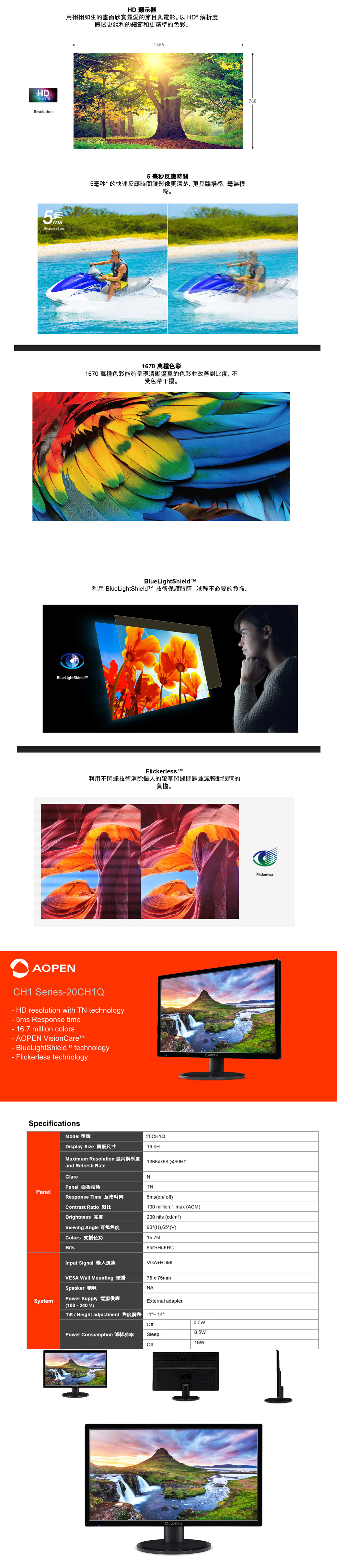 AOPEN 20CH1Q bi(1A1H/5ms/TN/無喇叭)低藍光.不閃爍