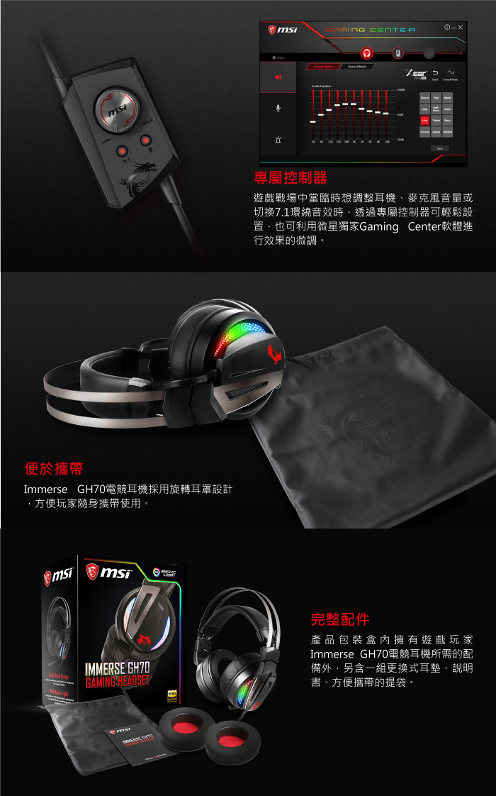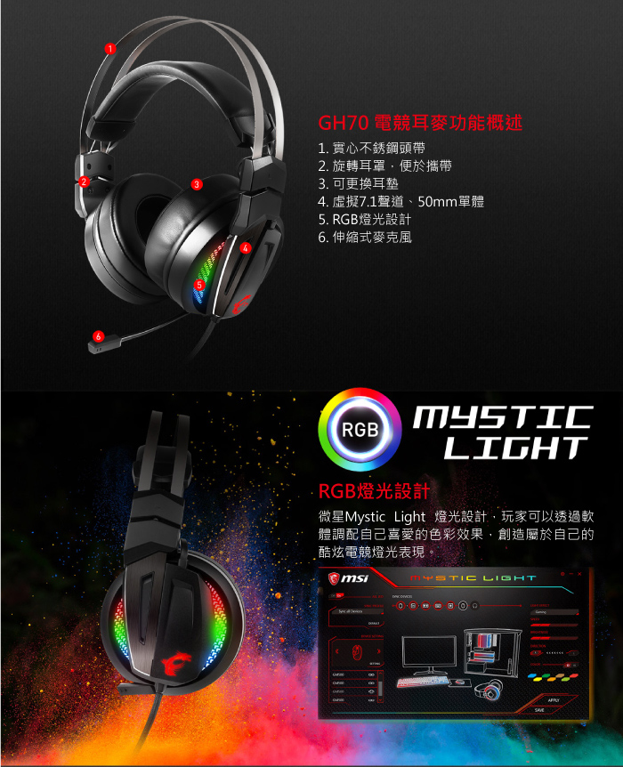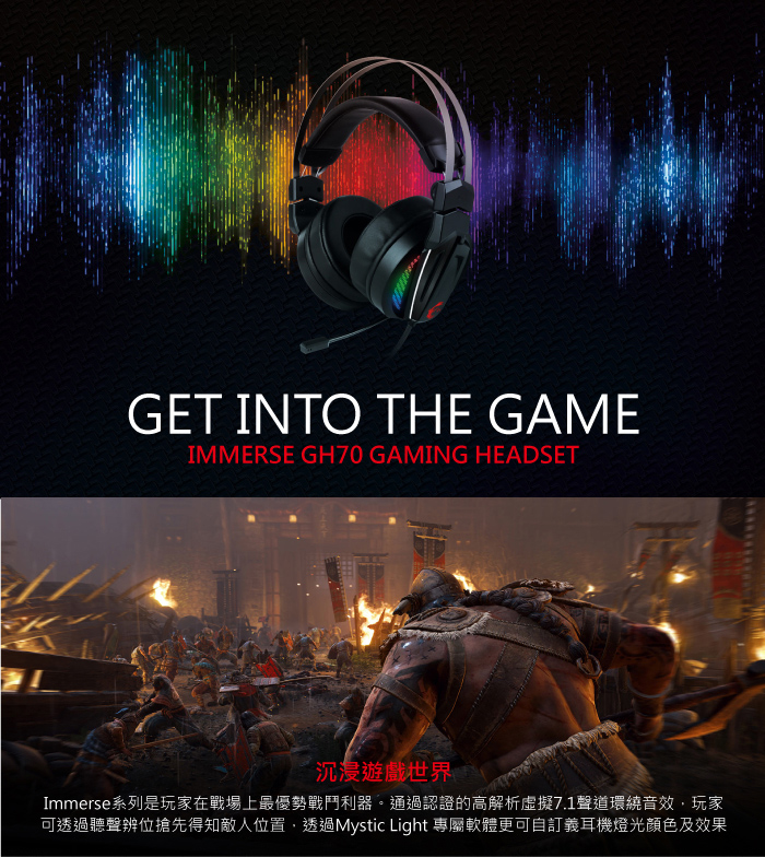 微星 Immerse GH70 電競耳機/有線/50mm單體/Hi-Res認證/虛擬7.1/RGB