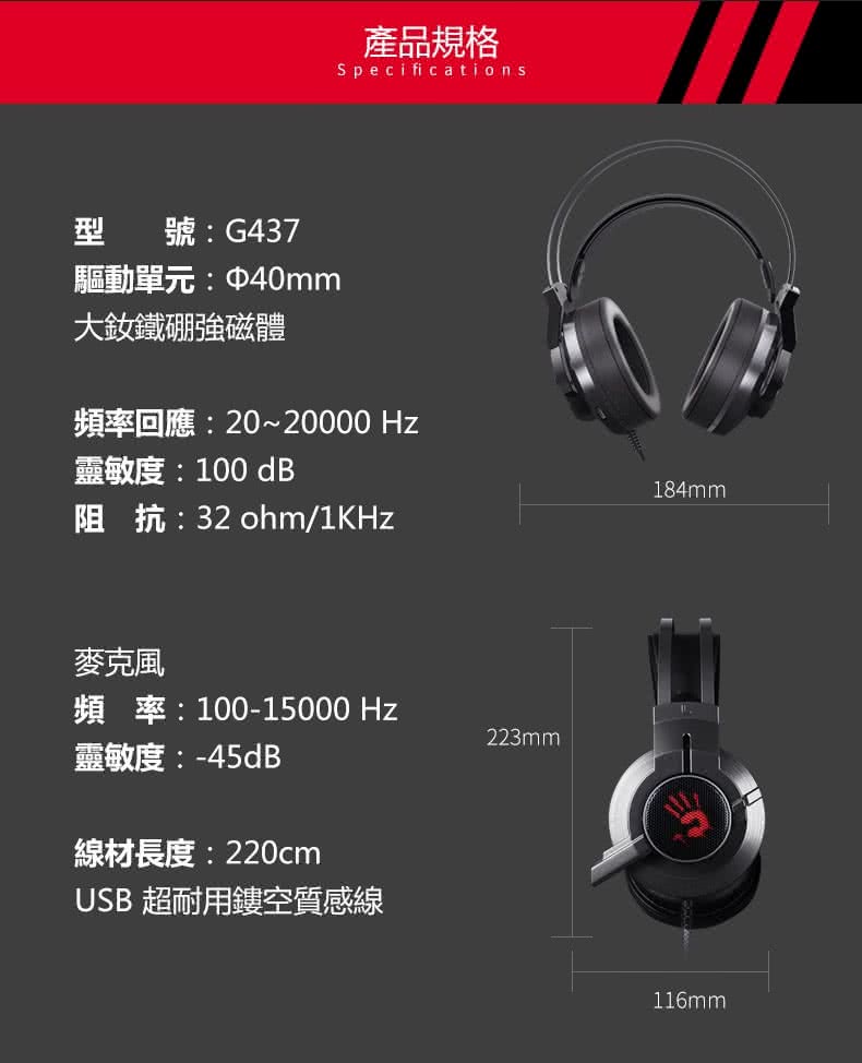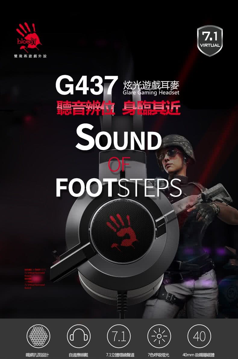 【限時特價】A4雙飛燕 Bloody G437 有線電競耳麥/有線/虛擬7.1/USB/抗噪-40MM單體(不含收納架)