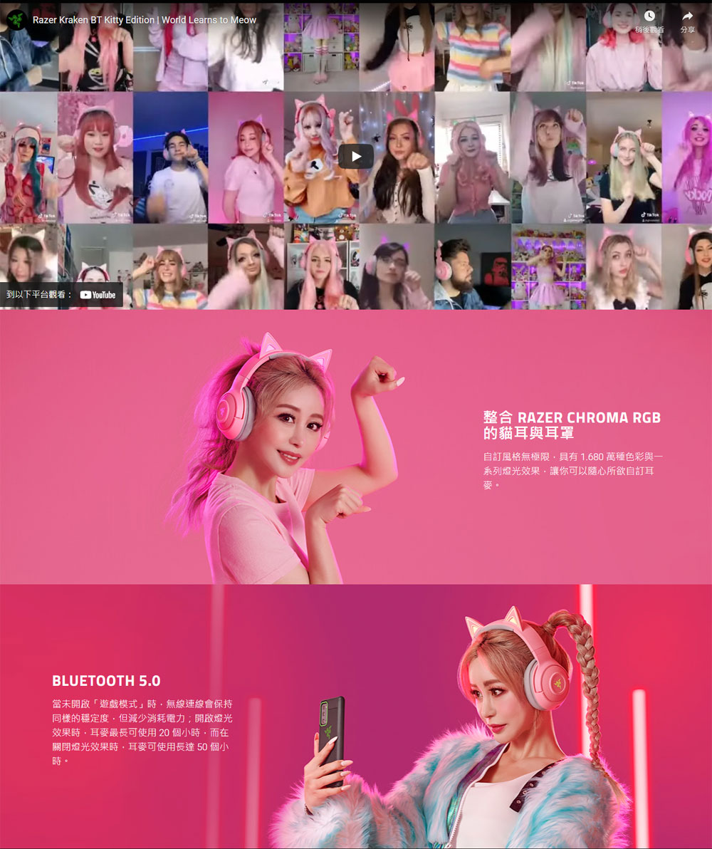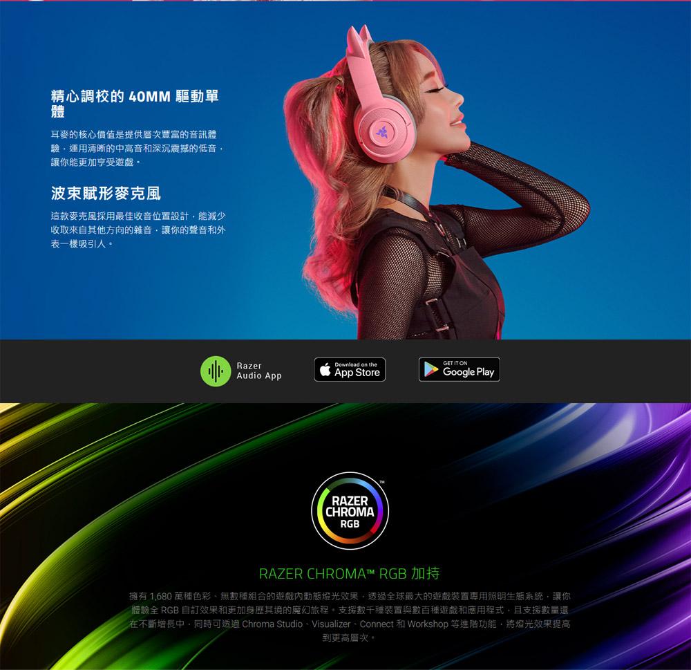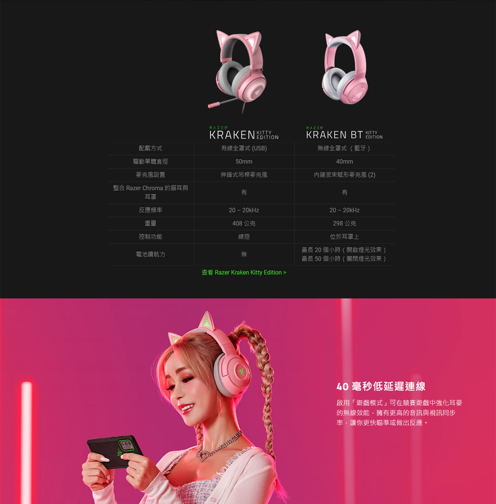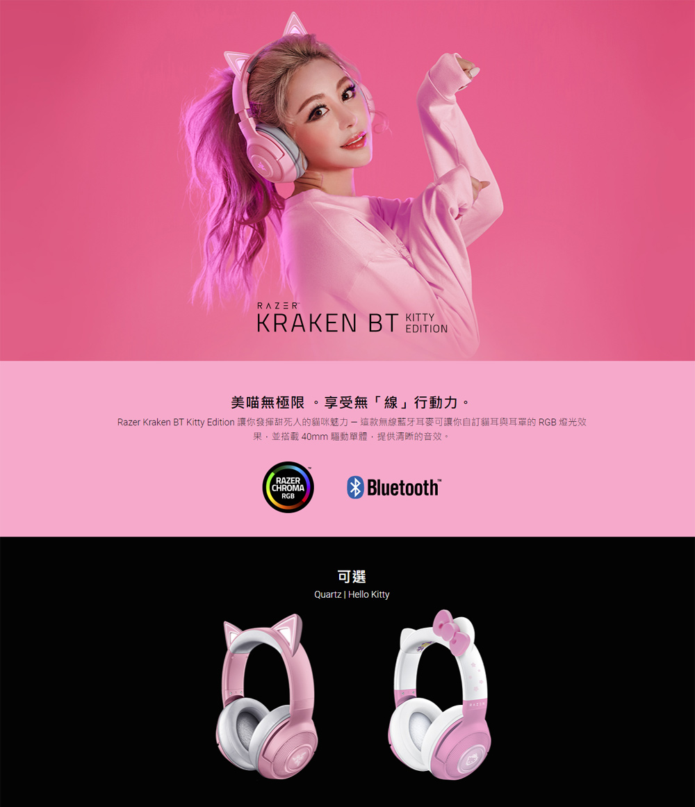 Razer Kraken BT Hello Kitty 藍芽耳機(粉晶)/無線/藍芽5.0/Hello Kitty貓耳/40mm/Rgb