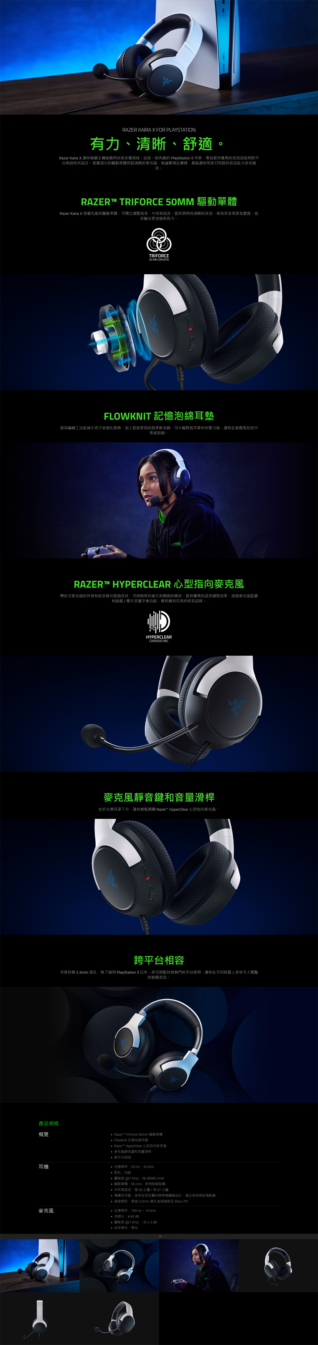 Razer Kaira X 噬魂鯊 黑白藍 電競耳機/有線/虛擬7.1/心型指向麥克風