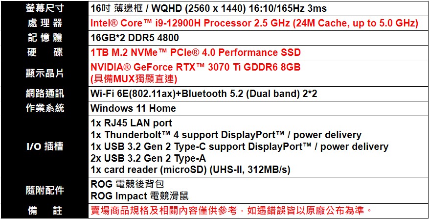 華碩 ROG GU603ZW-0022A12900H(黑)(i9-12900H/32G/1T SSD/3070Ti/165Hz/2K)