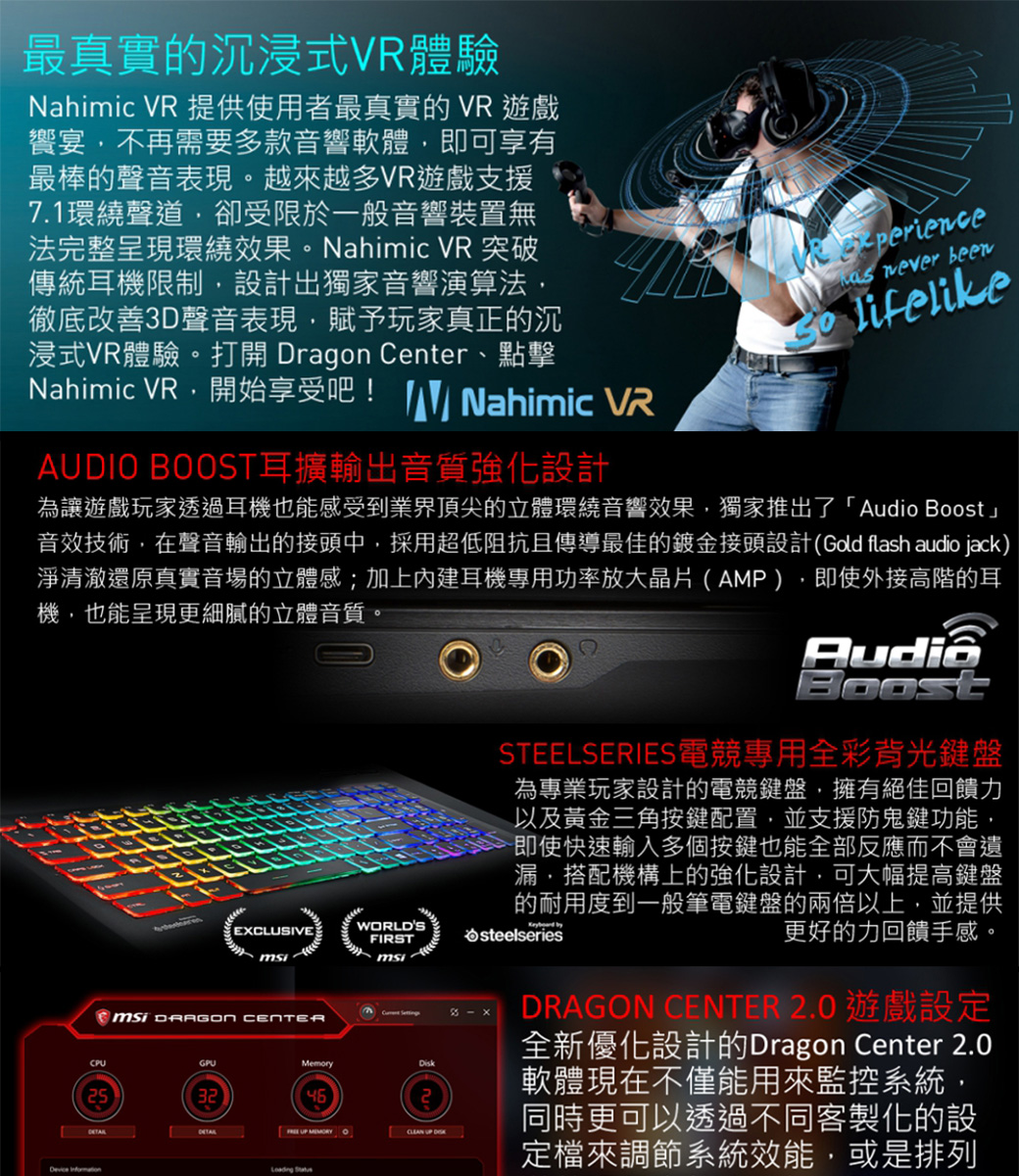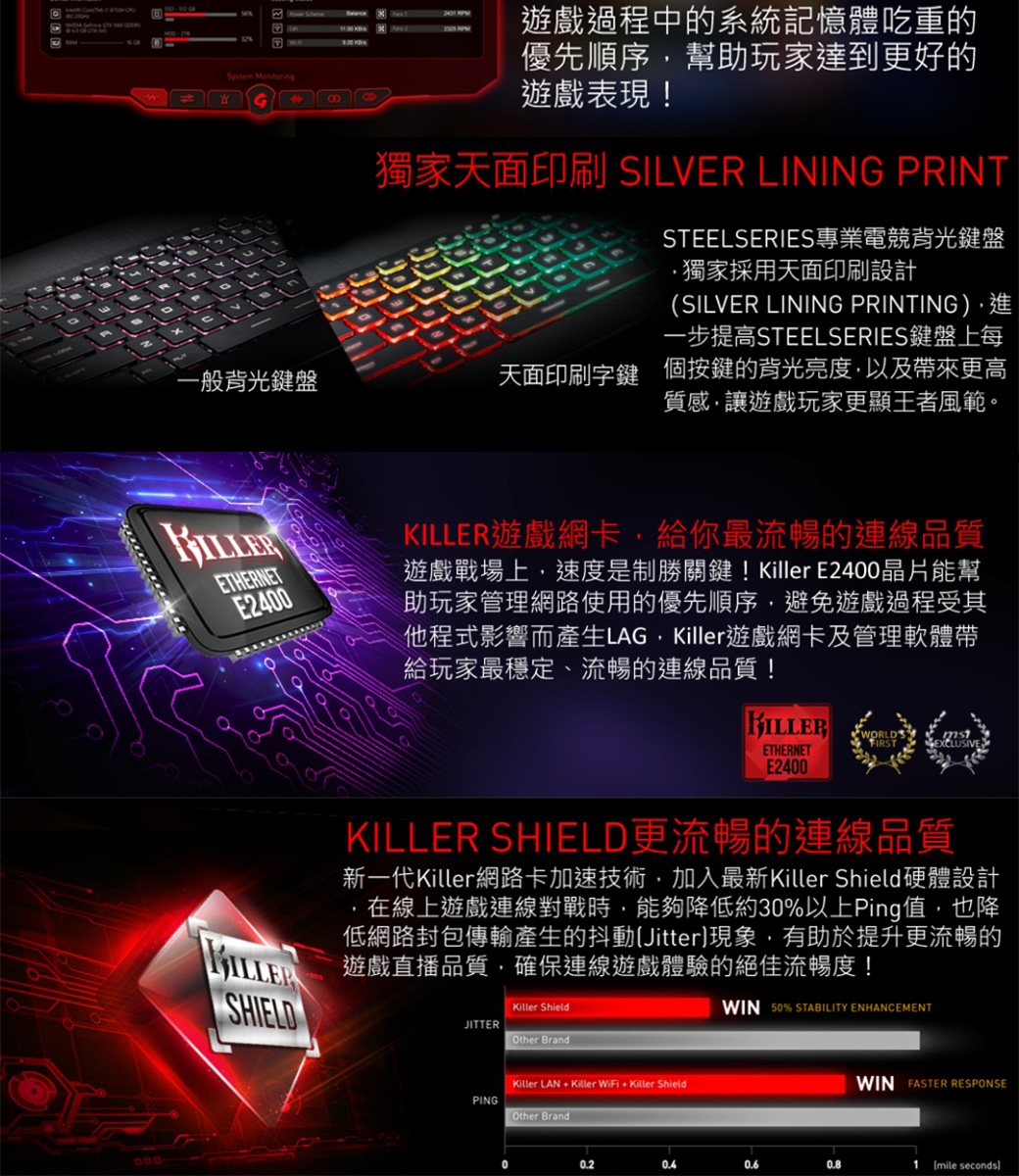 螢幕尺寸及解析度:15.6吋Full HD(1920x1080),120Hz/3ms廣視角電競面板 防眩光霧面護眼螢幕 處理器:Intel 第8代 Core i7-8750H 六核心處理器 (Base 2.2GHz up to 4.1GHz) / (Cache 9MB) 主機板晶片:Intel HM370 主記憶體:8GB DDR4-2400,最大可擴充至32GB 硬碟:256GB NVMe M.2 SSD by PCIe Gen3 +1TB 2.5吋 7200轉 HDD 顯示晶片規格:GeForce GTX1050 Ti GDDR5 4GB獨顯 擴充插槽:2個260 Pin So-DIMM 記憶體插槽 I/O連接埠: 1組 USB3.1 (Type-C ) 3組 USB3.1 (Type-A ) 1組 HDMI (4K @ 60Hz) 1組 Mini-DisplayPort 讀卡機支援: SD (XC/HC)…等格式 視訊鏡頭:HD type (30fps@720p) 音效: 2組 3瓦喇叭(揚聲器)Speaker 1組 麥克風輸入(Mic-in) 1組 耳機/音源輸出Headphone-out (HiFi / SPDIF) 光碟機:無,請另購外接式光碟機 支援網路 有線: 電競專用Killer E2400 Gigabit Ethernet 無線: 電競專用Intel Wireless-AC 9560 藍牙: 最新5.0版 鍵盤/輸入裝置:SteelSeries電競專用全彩可調式背光鍵盤 電池:6-Cell / 180瓦 作業系統:Windows 10 Home 尺寸及重量:383x 260 x 29 mm 2.2公斤 保固:2年保固,台灣地區2年到府收送 全省全家便利商店代收送服務 免費客服電話0800-018880