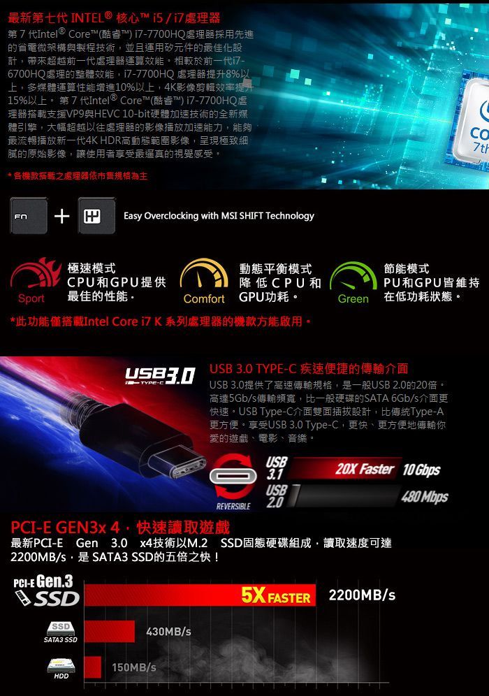 ●作業系統:Windows10 ●處理器:INTEL i7-7700HQ●顯示卡:GTX 1070, 8GB GDDR5●記憶體:32GB DDR4(16GD4*2)●螢幕:17.3" FHD (1920x1080), IPS-Level●硬碟:256GSSD(M.2 PCIE)+ 1TB 7200轉●光碟機:DVD Super Multi Optical Drive●網路裝置:Killer Double Shot●電池:9-Cell Li-Ion Battery (Type) 83 (Whr)●尺寸:428 x 294 x 48mm ●重量:3.7Kg●視訊鏡頭:Full HD type●音效:2x 3W 喇叭 1x 5W 低音喇叭●I/O連接埠:1x Type-C USB3.1 Gen26x Type-A USB3.01x RJ451x SD (XC/HC) 讀卡機1x (4K @ 60Hz) HDMI1x Mini-DisplayPort