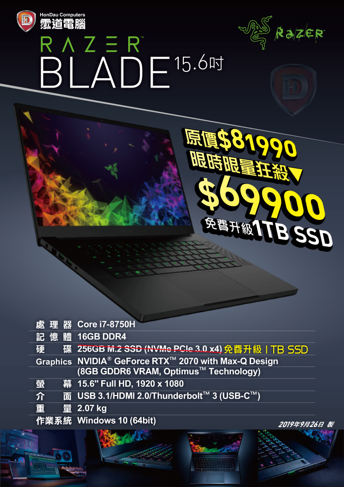 Razer BLADE 15.6吋電競筆電(i7-8750H/16G/1TB/RTX2070-8G/144Hz)限時限量
