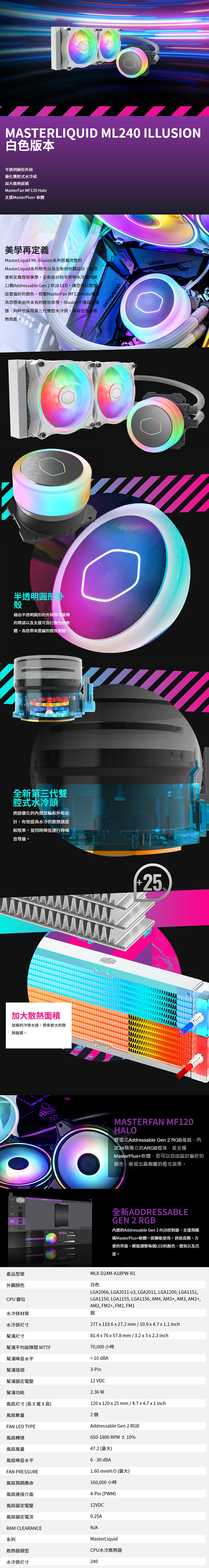酷碼 MasterLiquid ML240 ILLUSION /半透明冷頭/A.RGB GEN2/厚:5