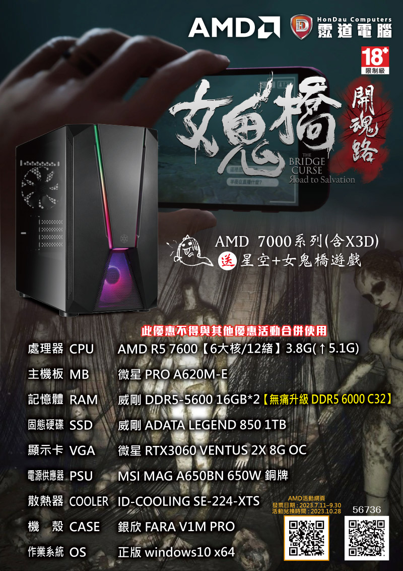 【中階電競機】AMD微星-女鬼橋開魂路遊戲機 R5 7600/A620M/RTX3060/1TB/16G*2/WIN 10(56736)