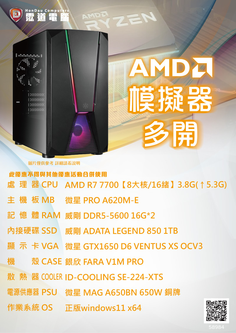 【AMD模擬器多開電競機】 R7 7700/A620M/GTX1650/16GB*2/1TB/650W/WIN 11(58984)