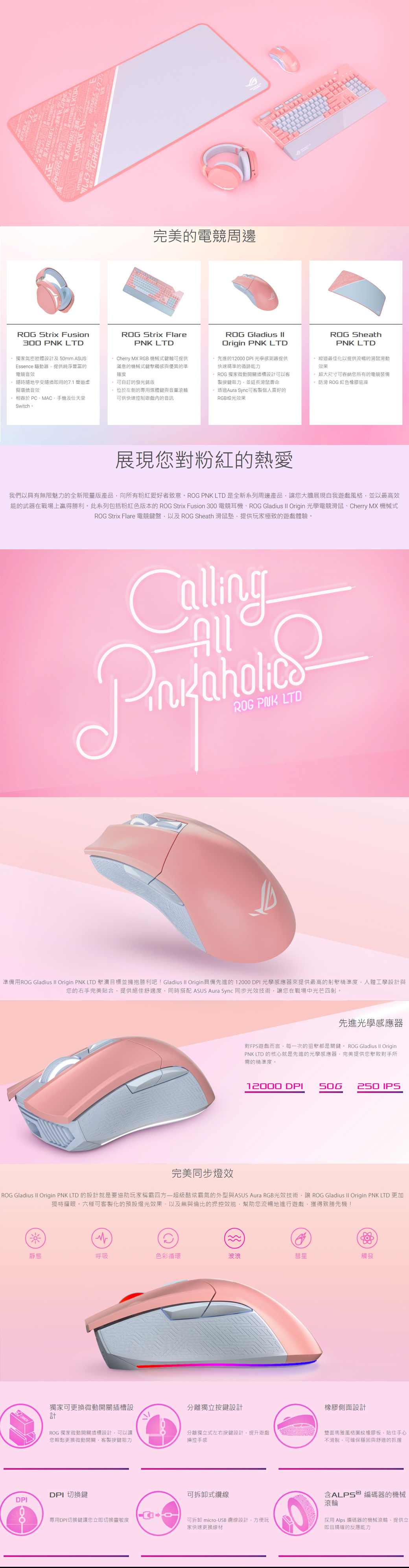 華碩 ROG Gladius II ORIGIN 粉紅版 電競滑鼠/有線/12000dpi/微動可換/RGB
