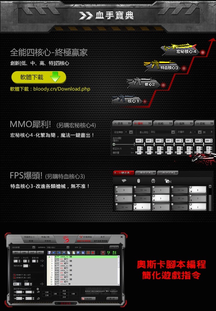 ◆ 血手寶典-智慧四核心,創新【低、中、高、特】四核心,如同擁有四隻不同技能滑鼠,廣泛適用於MMO、RPG、FPS各類遊戲。