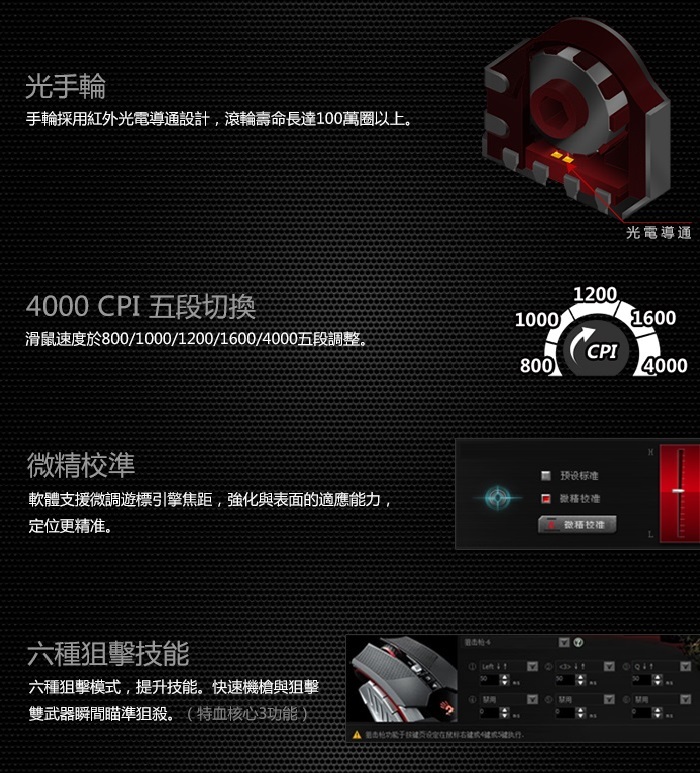 最高4000遊戲dpi按鍵可調 可自定義800/1200/1600/1800/4000dpi,五段dpi設定,滿足不同玩家的遊戲需要!