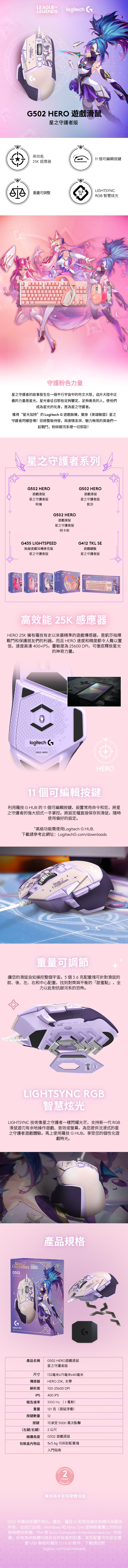 • 羅技 G502 Hero 電競滑鼠-星光戰士版(阿卡莉)/有線/25600Dpi/砝碼/Rgb/飛輪滾輪