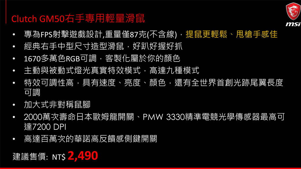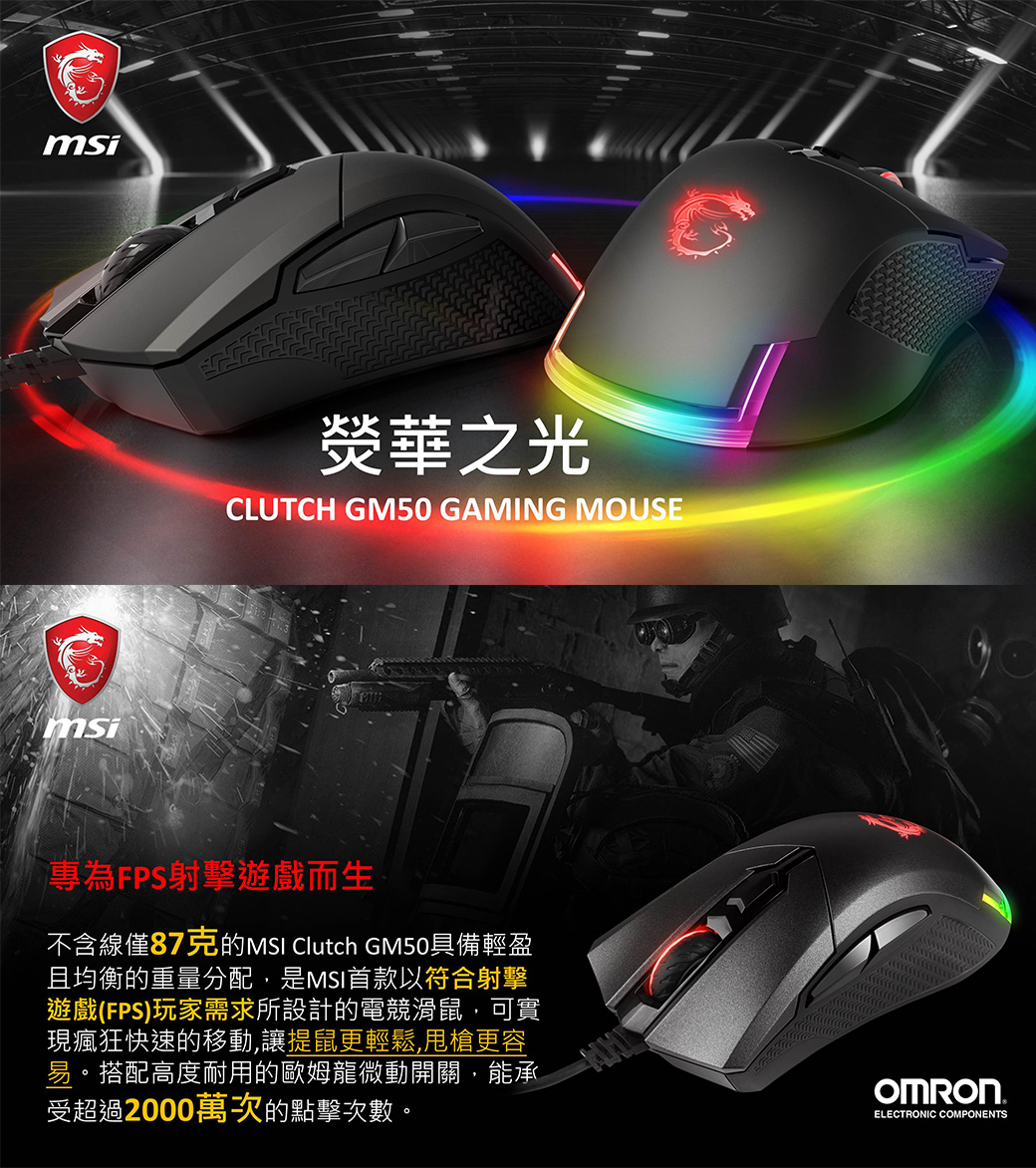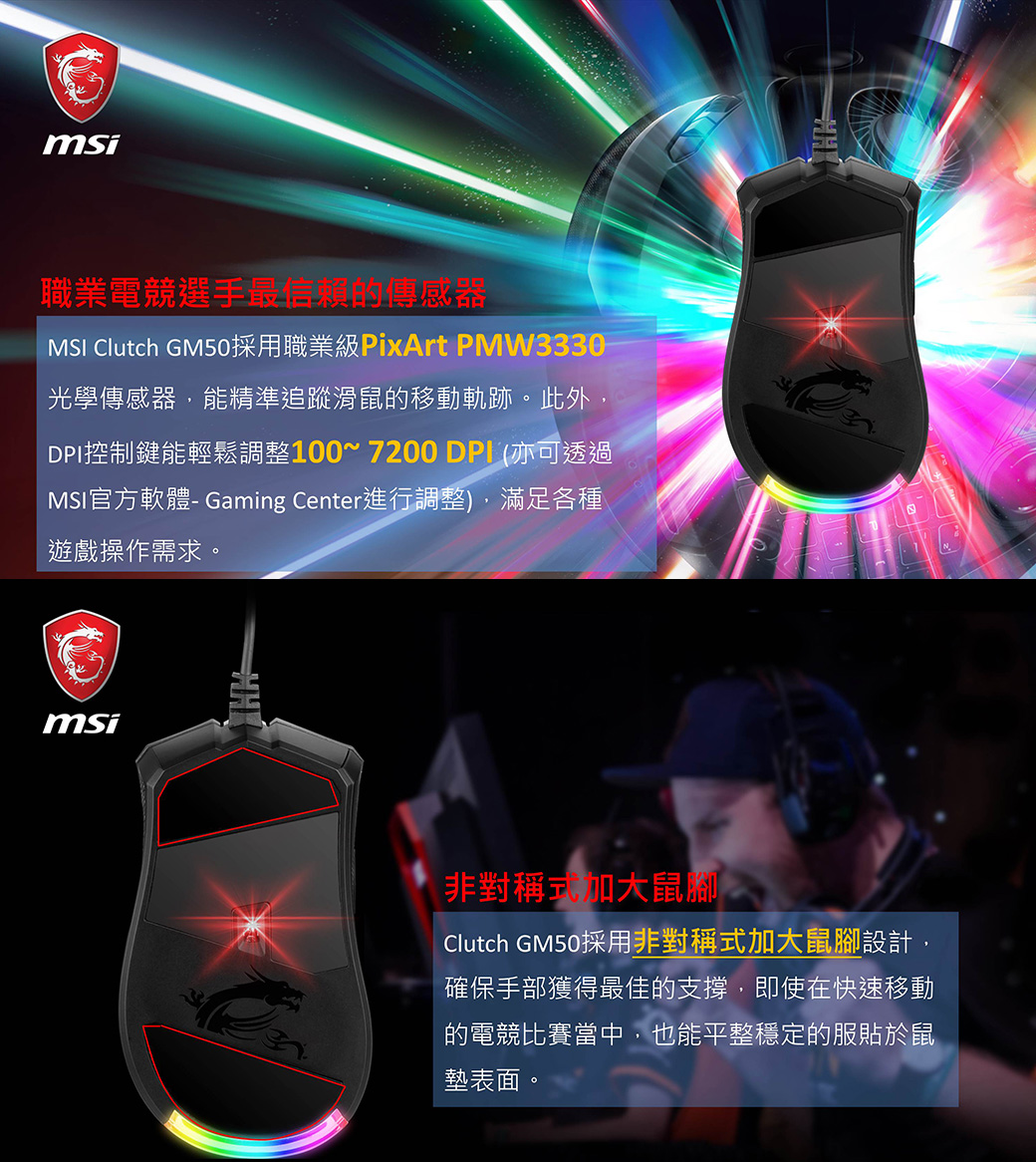 MSI微星 GM50輕量化RGB電競滑鼠(右手FPS遊戲用)