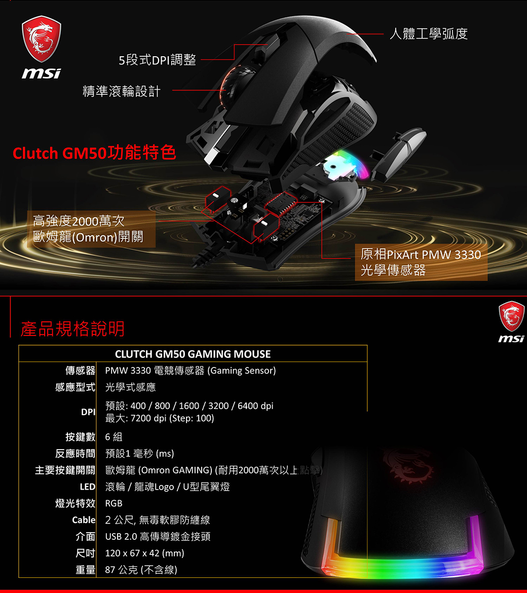 MSI微星 GM50輕量化RGB電競滑鼠