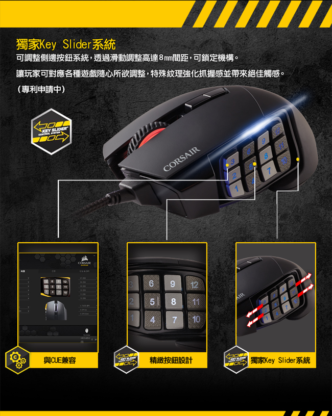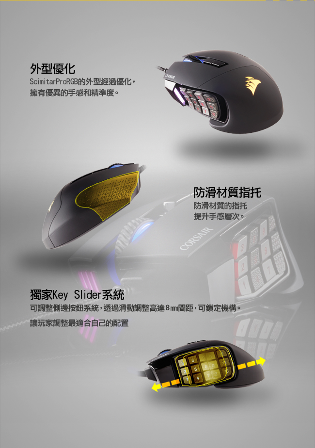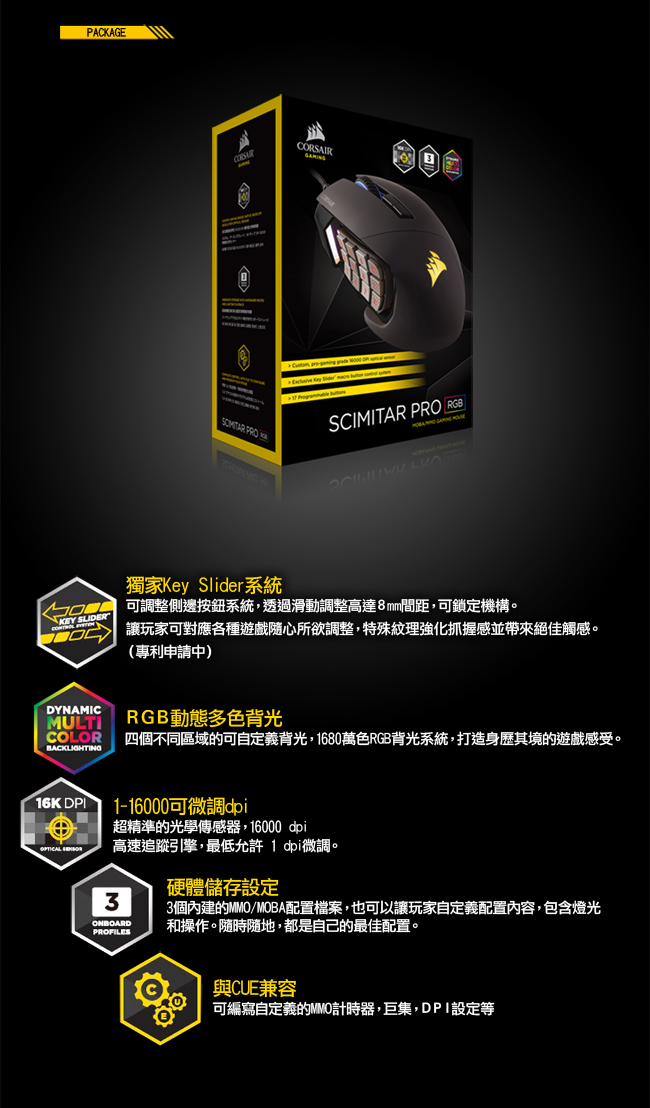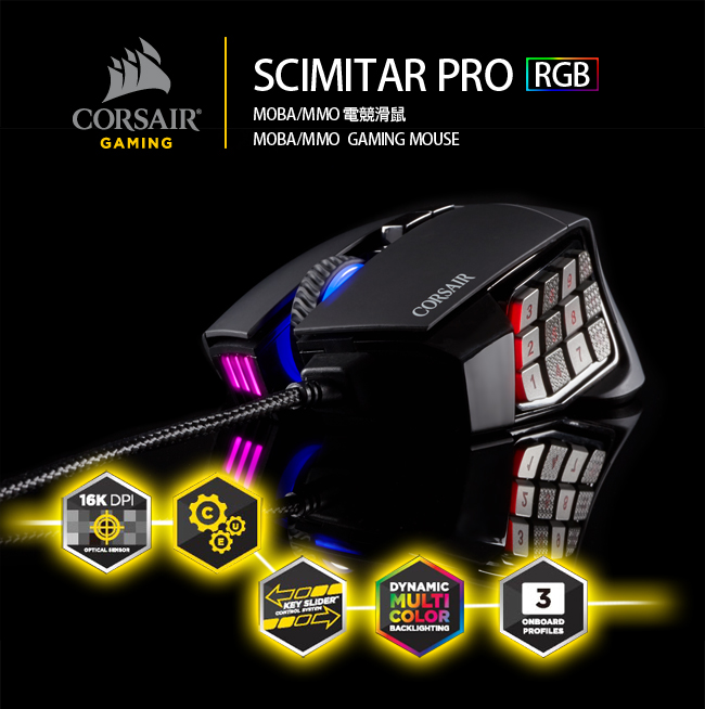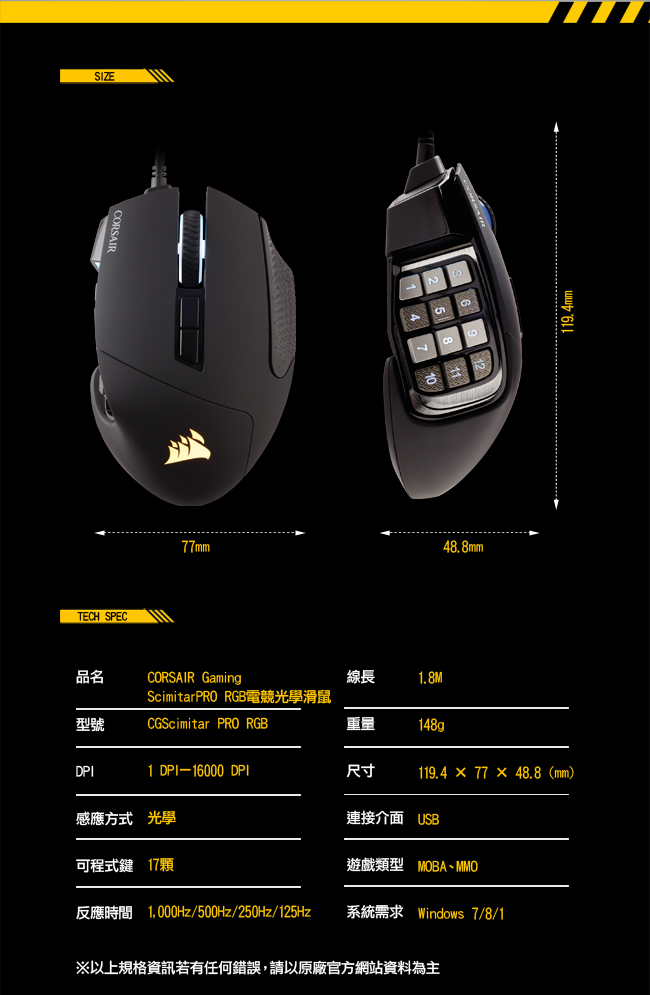 品名:CORSAIR Gaming ScimitarPRO RGB電競光學滑鼠-黑 型號:CGScimitarPro-BK DPI: 1 dpi - 16000 dpi 感應方式: 光學 可程式鍵:17顆 線長:1.8m 重量:147g 連接介面:USB 反應時間:1000Hz、500Hz、250Hz、125Hz 尺寸:119.4 x 77 x 48.8 mm 遊戲類型:MOBA、 MMO 系統需求:Windows 7/8/10 ※以上規格資訊若有任何錯誤,請以原廠官方網站資料為主
