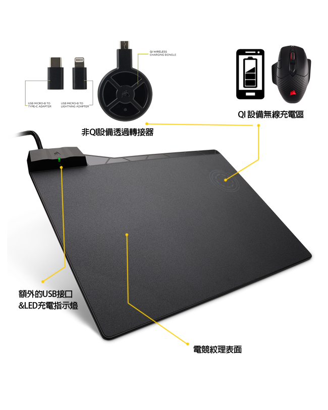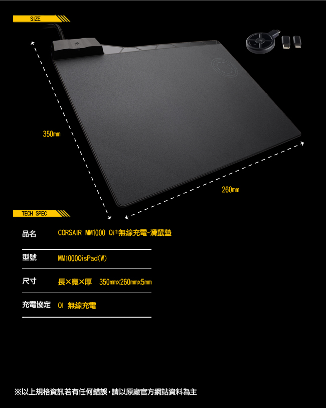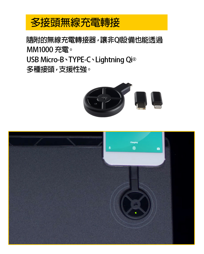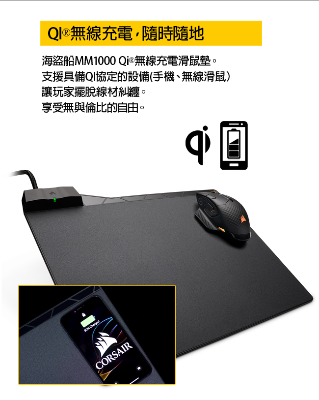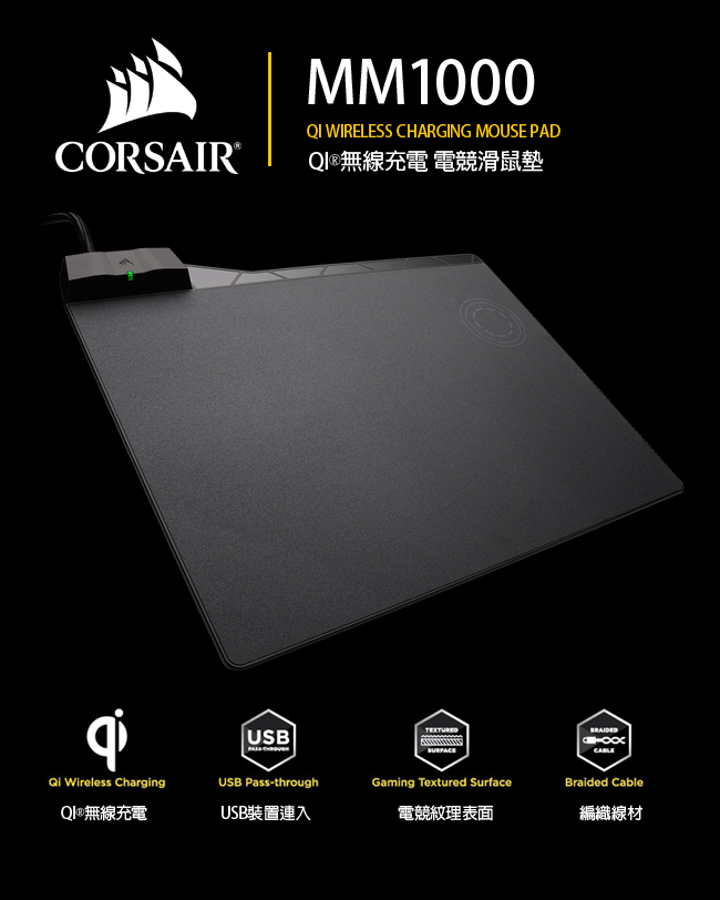 品名:CORSAIR MM1000 Qi®無線充電-滑鼠墊 型號:MM1000QisPad(W)