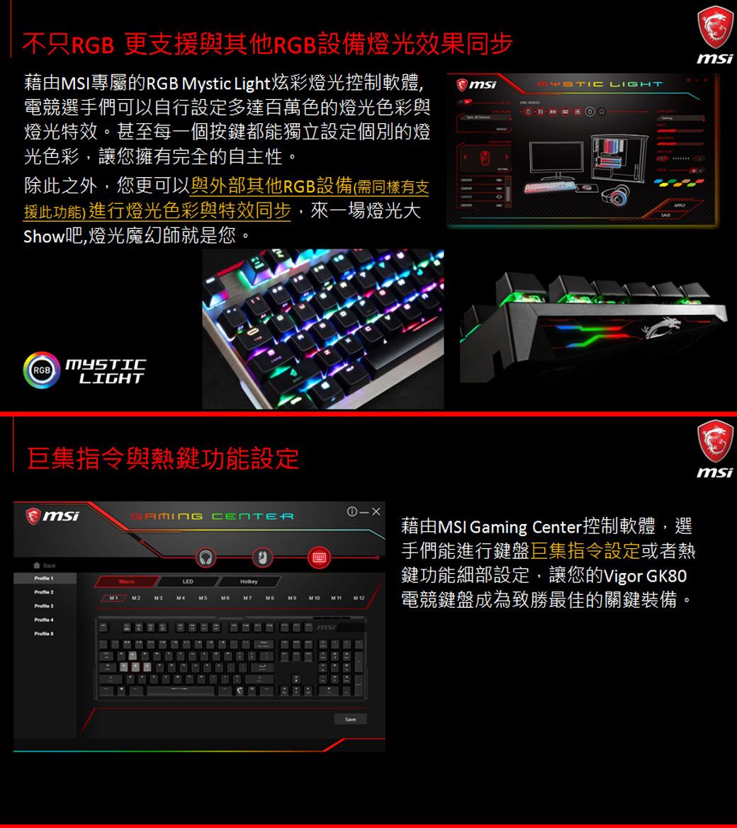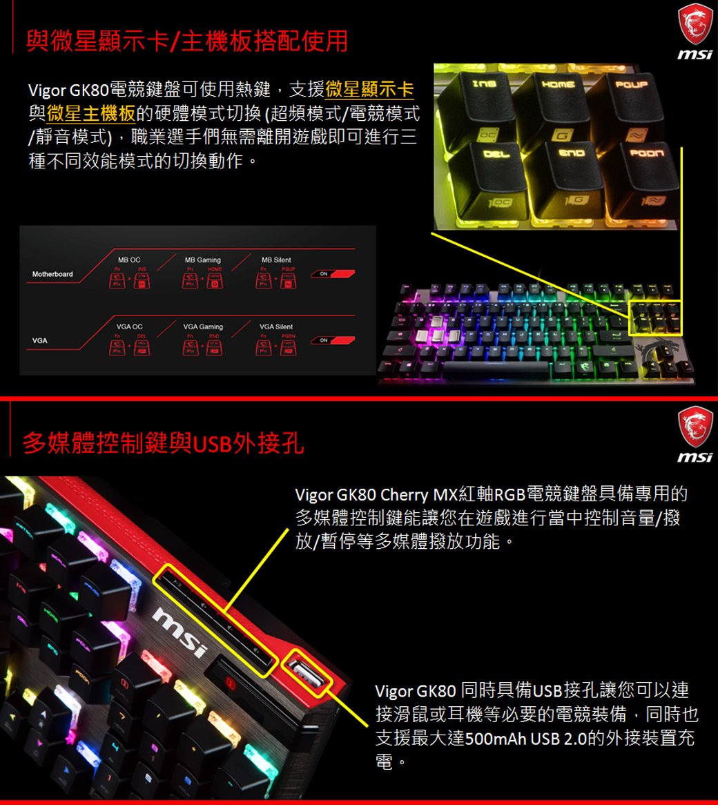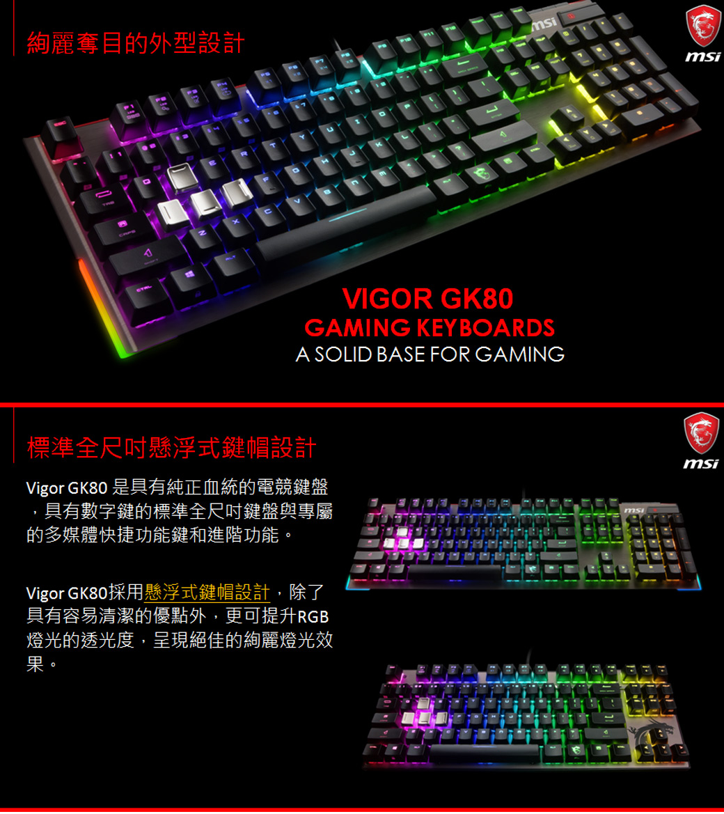 微星 Vigor GK80 MX RGB機械電競鍵盤/有線/紅軸/懸浮鍵帽/中文