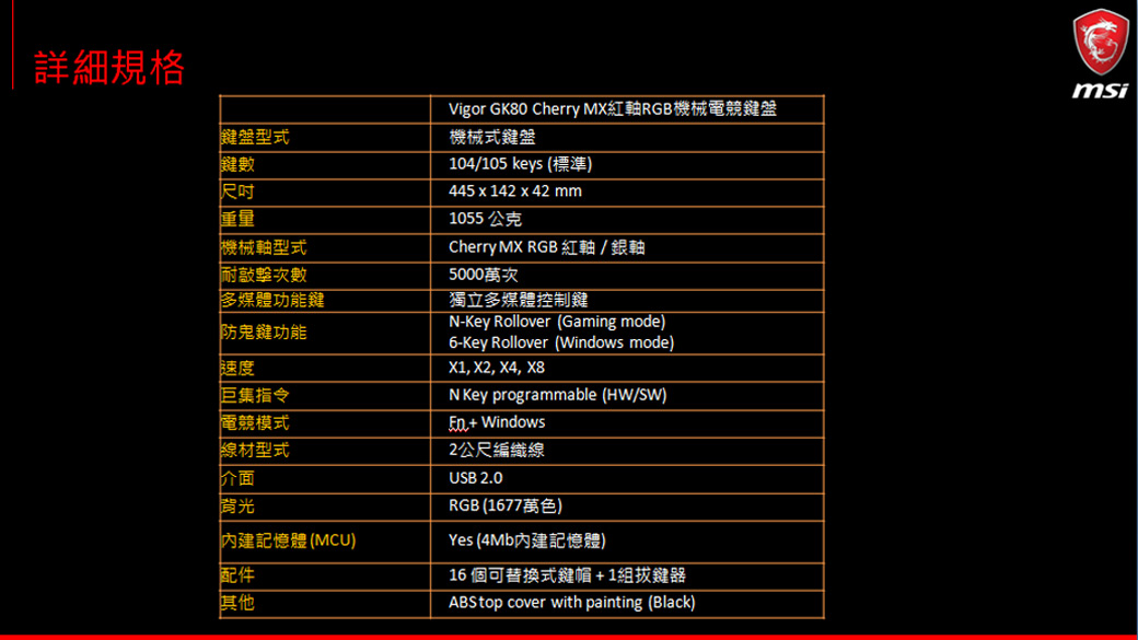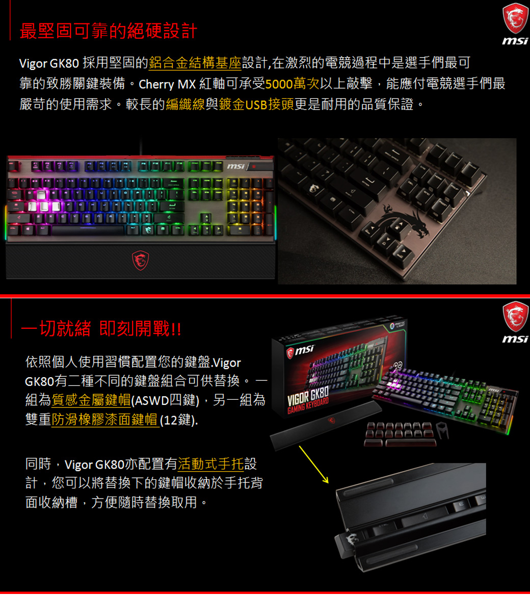 • 微星 Vigor GK80 MX RGB機械電競鍵盤(紅軸)