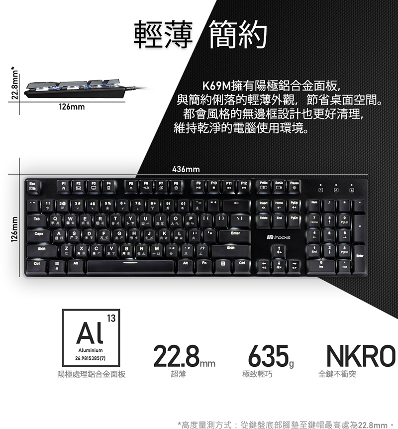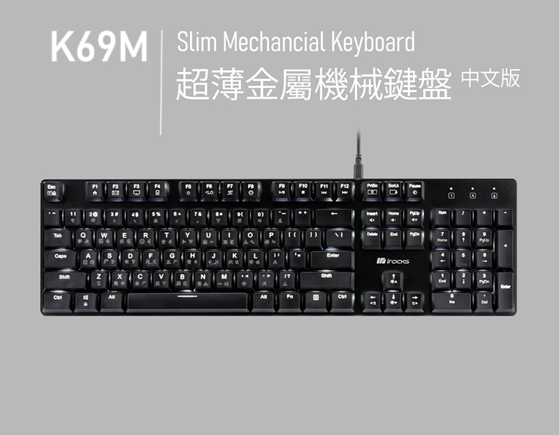 I-ROCKS K69M 超薄金屬機械式鍵盤/有線/紅軸/超薄矮軸/中文/黑色/白光
