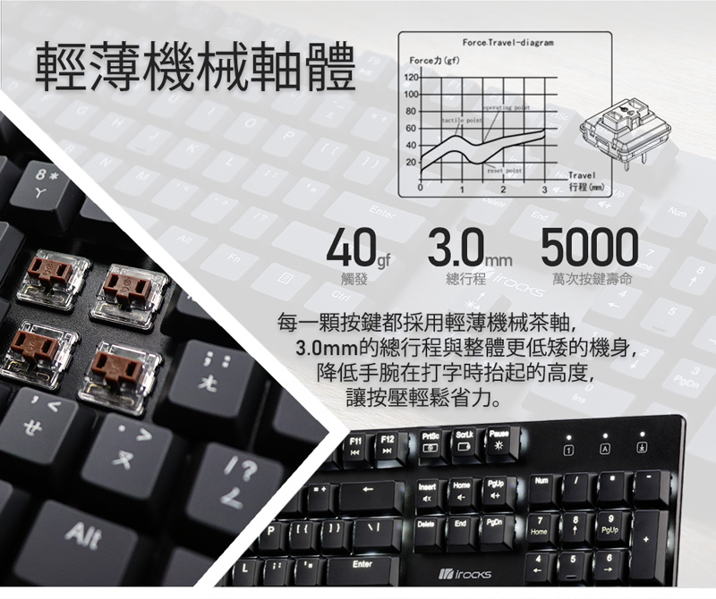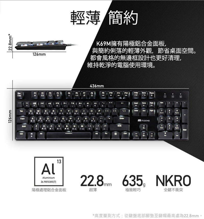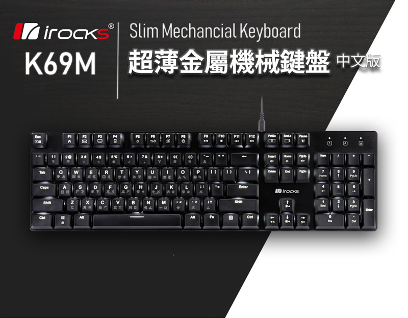 I-ROCKS K69M 超薄金屬機械式鍵盤/有線/茶軸/超薄矮軸/中文/黑色/白光