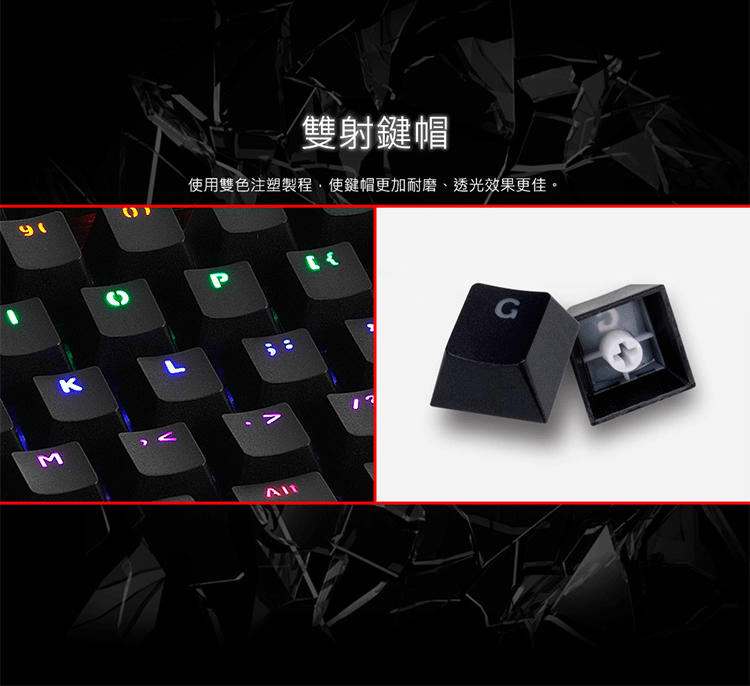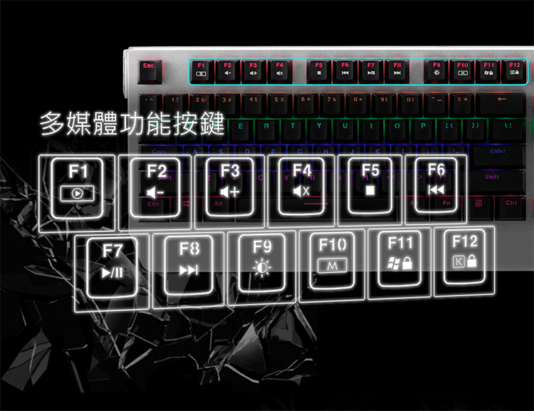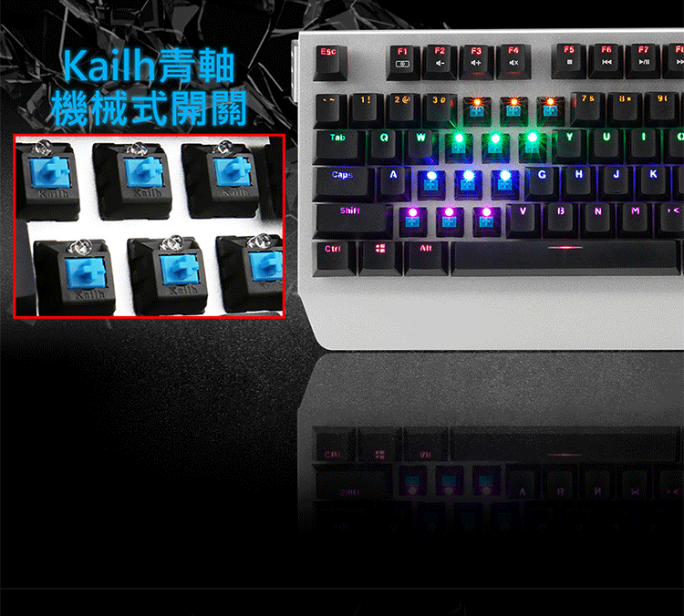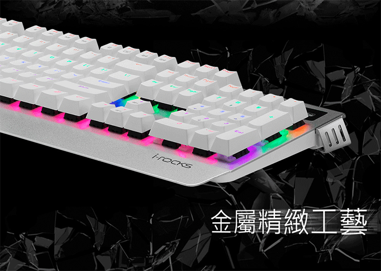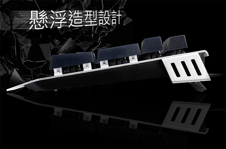 機械開關設計,擁有高達5000萬次敲擊壽命。高質感金屬工藝面板及可調整腳架設計。雙色注塑成型鍵帽加雷雕符號不磨損。USB介面連接,全鍵不衝突設計。LED背光,科技感的視覺印象。單色多彩分區發光,內建12種背光效果。可鎖住Windows鍵及Application鍵功能,防止遊戲中誤按。提供全區按鍵鎖鍵功能,避免誤觸按鍵。多媒體快捷鍵功能。特殊三向線槽設計。隨插即用,不需任何驅動程式