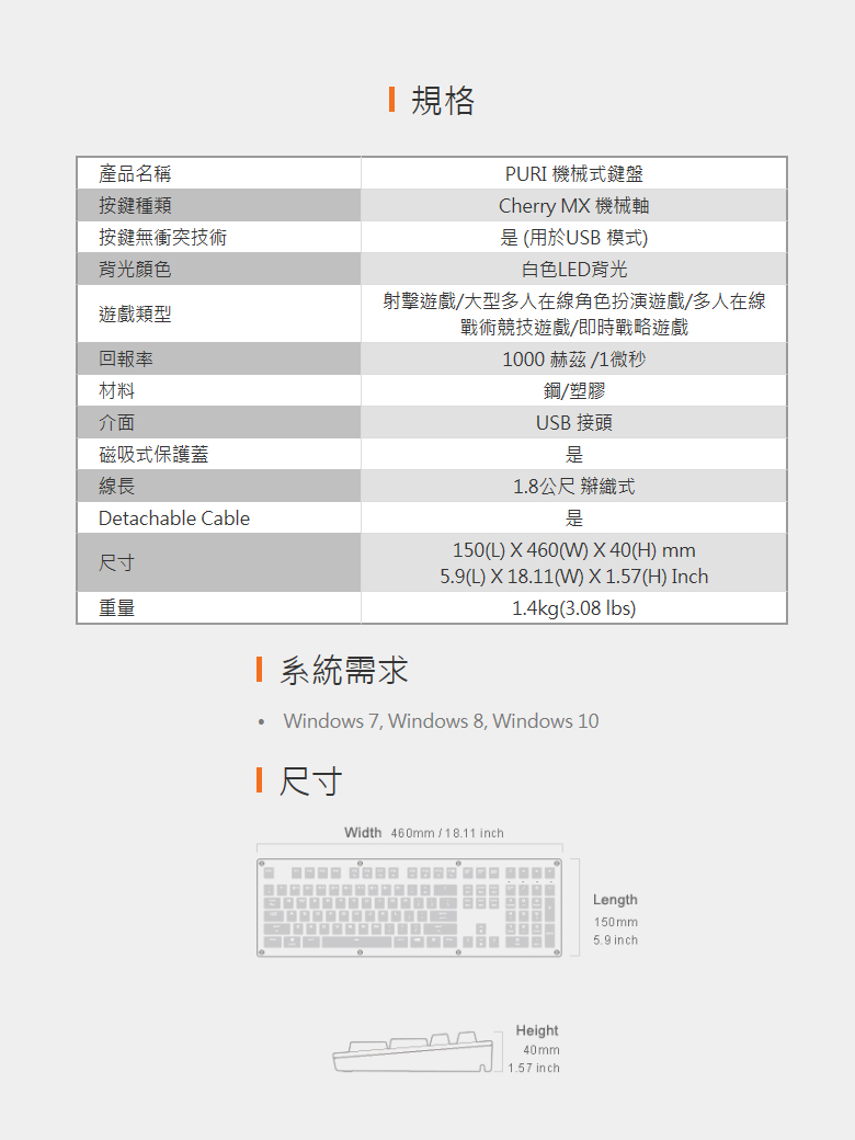 • PURI 白光專業機械式電競鍵盤【紅軸】