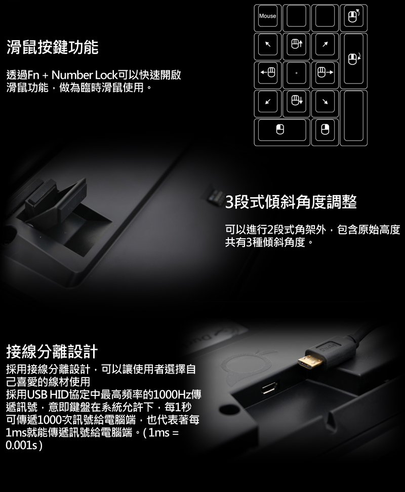 結構:機械式結構 軸:Cherry MX 機械軸 鍵帽材質:PBT 印字技術:側印 介面:USB 按鍵輸出:USB N-Key Rollover 尺寸:440 x 140 x 41 mm 重量:1.3kg 保固:原廠一年保固 ※實際傳輸速度會因您的系統效能(ex: 硬體, 軟體, 使用方式...)而有所不同。 ※所有配件皆以原廠實際出貨所附配件為準。 ※以上規格資料若有任何錯誤或原廠更動,以原廠所公佈資料為準。 ※因適逢產品變更包裝設計,出貨包裝有新舊版視覺之不同,隨機出貨,但內容物不變,敬請見諒。 ※由於運費與完善售後服務的考量,恕此商品不提供配送至離島地區,請客人見諒!