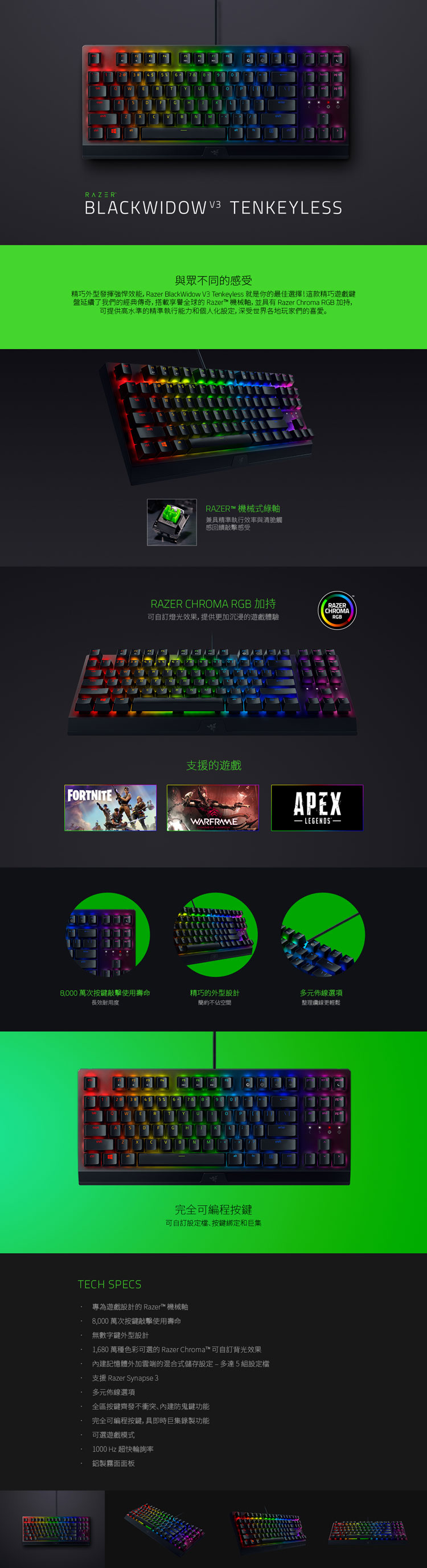 • 雷蛇Razer BlackWidow V3 Tenkeyless 黑寡婦蜘蛛V3短軸機械式鍵盤/有線/綠軸/英文/RGB