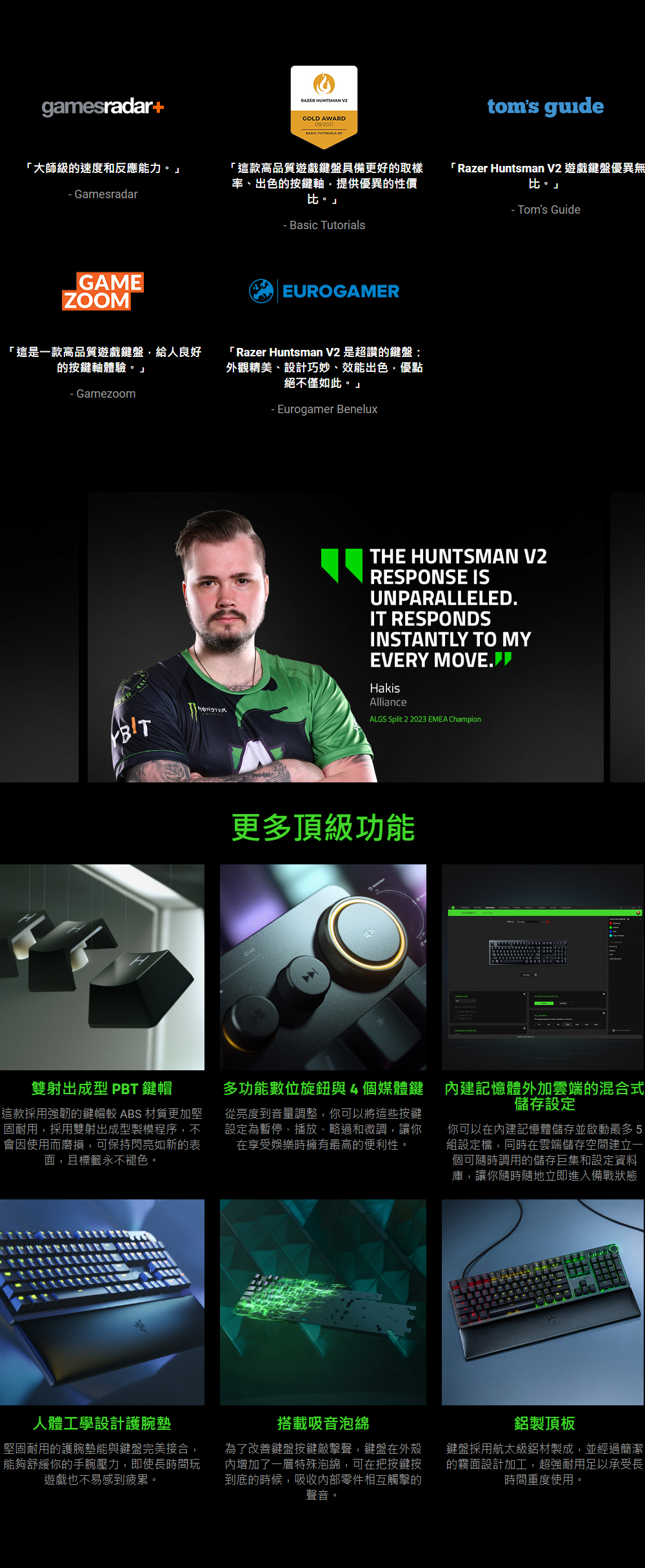 | 按鍵 | Razer 雙射出成型 ABS 鍵帽 |
