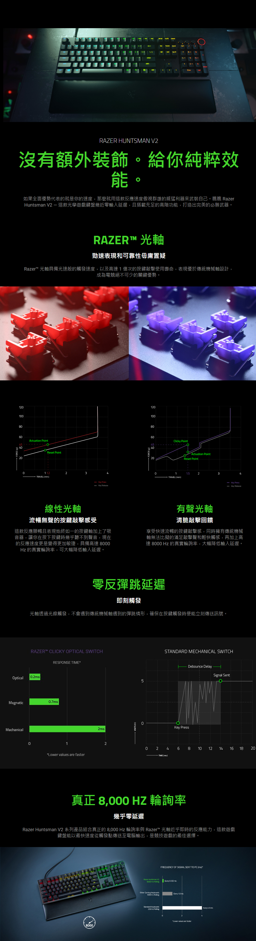| 其他 | 按鍵壽命高達 1 億次按鍵敲擊 Razer™ HyperPolling 技術,高達 8000 Hz 的真實輪詢率 完全可編程按鍵,具即時巨集錄製功能 全區按鍵齊按不衝突,內建防鬼鍵功能 遊戲模式選項 鋁製霧面 |