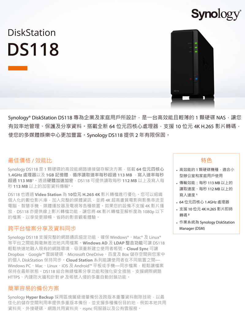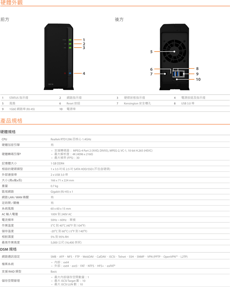 Synology DS118【1Bay】Realtek RTD1296 四核心 /1G/G-LAN*1/U3*2