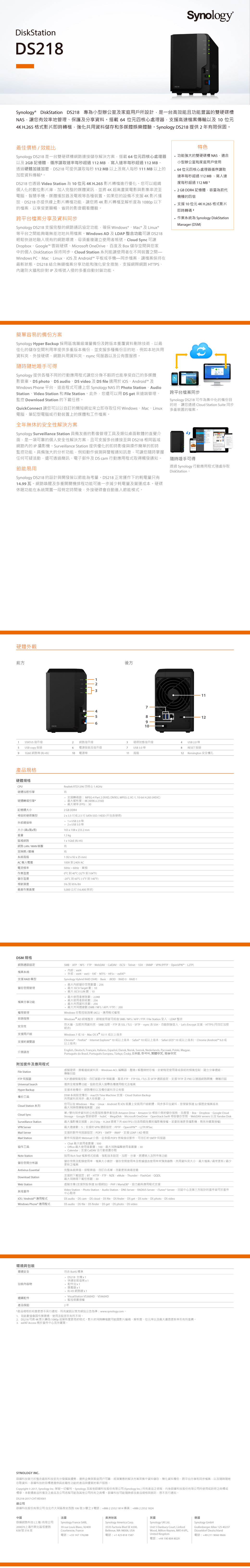 Synology DS218 【2Bay】Realtek RTD1296 四核心/2G/U3*3