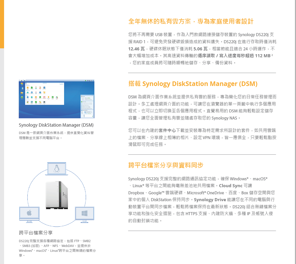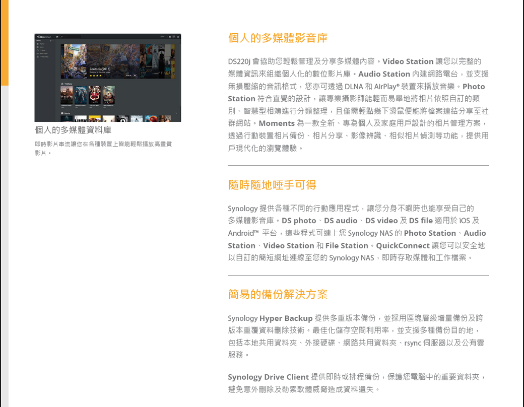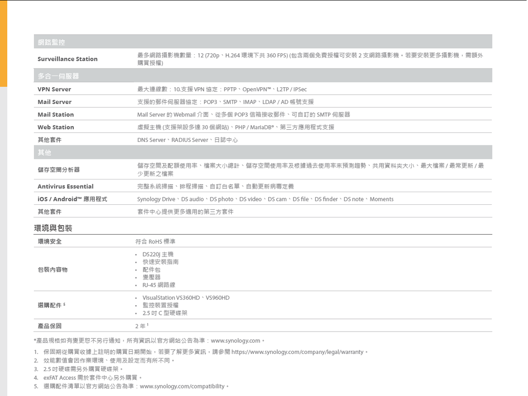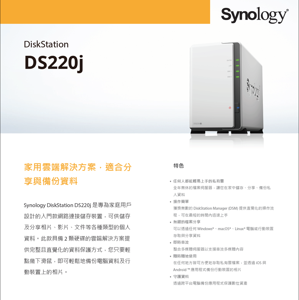 Synology DS220J 【2Bay】Realtek RTD1296 四核心/512MB/G-LAN*1/U3*2