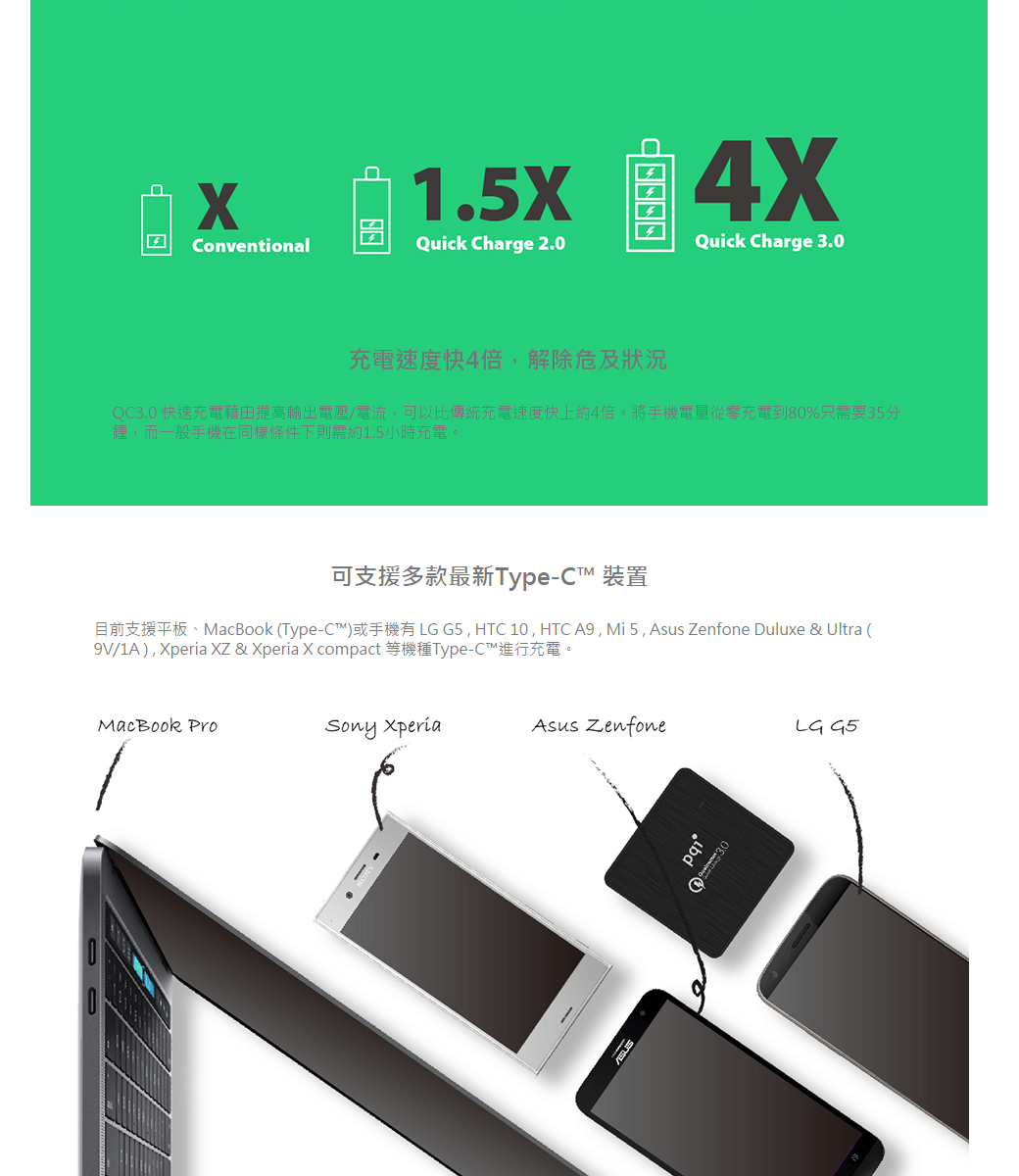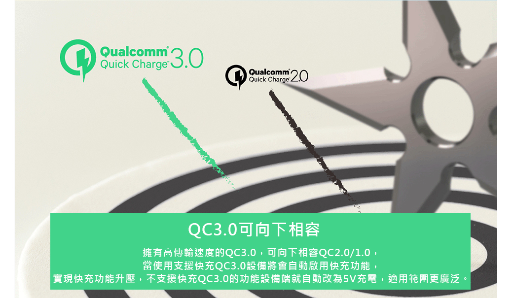 可支援多款QC3.0手機並可向下相容及MacBook