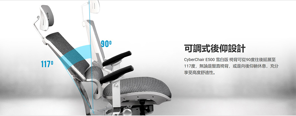 • Cyberchair E500(雪白版)人體工學網椅/鋁合金骨架/4D 扶手/鋁合金五星腳/90°~117°