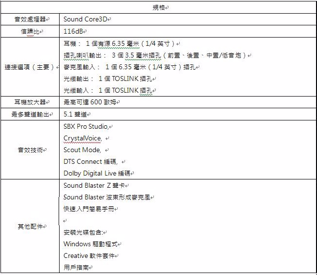 • Creative SB Z/PCI-E/訊噪比:116db/5.1/光纖