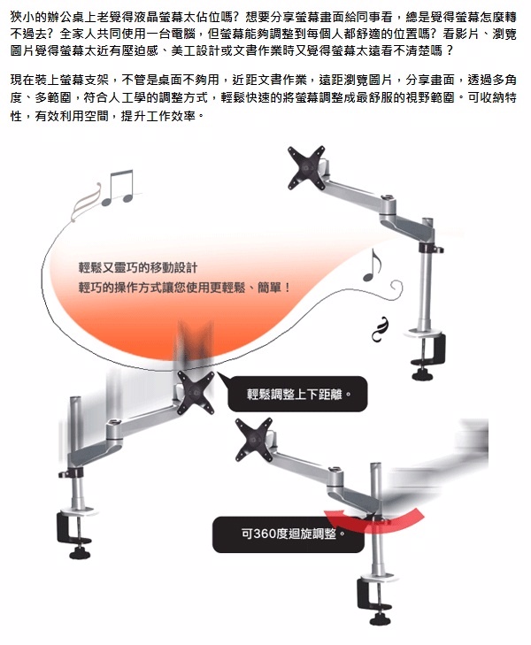 大角度、大範圍,可輕鬆將螢幕調整至舒服視角