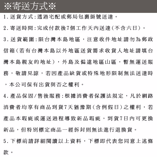八、服務之停止、中斷 本網站將依合理之技術及方式,維持系統及服務功能之正常運作。但於以下各項情況時,本網站有權可以停止、中斷提供本服務: o 網站電子通信設備進行必要之維護及施工時 o 發生突發性之電子通信設備故障時 o 本網站申請之電子通信服務被停止,無法提供服務時 o 由於天災等不可抗力之因素或其他不可歸責於本網站致使網站無法提供服務時 九、交易行為及售後服務 1.會員使用本網站進行交易時,應依據網站上所提供之確認商品數量及價格機制進行。 2.會員同意使用本網站訂購產品時,於本網站通知確認交易成立前,本網站仍保有不接受訂單或取消出貨之權利。會員向本網站發出訂購通知後,系統將自動發出接收通知,但此通知並非訂單確認通知,關於交易成立與否本網站將另行告知。 3.會員若於使用本網站訂購產品後倘若任意退換貨、取消訂單、或有任何本網站認為不適當而造成本網站作業上之困擾或損害之行為,本網站均可視情況採取拒絕交易或永久取消會員資格辦理。若會員訂購之產品屬於以下情形:(1)預購類商品(2)商品頁顯示無庫存(3)須向供應商調貨(4)轉由廠商出貨,因商品交易特性之故,倘商品缺貨或停產、或廠商因故無法順利供貨導致訂單無法成立時,本網站將以最適方式告知。 4.會員使用本網站進行交易時,得依照消費者保護法之規定行使權利。 據消保法規定,凡購買之消費者均享有商品到貨七天(包含假日)鑑賞期之權益(※鑑賞期非試用期)。 5會員退貨注意事項: .退回商品必須是全新狀態,完整包裝及附件都需齊全,如有缺少恕無法辦理退貨程序。 十、售後服務 1.您所購買的商品依法享有商品到貨七天(包含假日)鑑賞期之權益(※鑑賞期非試用期)。。如您收到的商品有瑕疵或異常問題,請參考下列退貨辦法 2. 退貨辦法: 請注意,退貨的商品必須為全新狀態且完整包裝 ( 包含主機、附件、內外包裝、隨機文件、贈品等 )。 此外,下列情形將影響您的退貨權益: (1)隨商品已附上相同之試用品,或在收到商品前已提供您試聽、試用之機會。 (2)您已至展售中心鑑賞過實際商品,且另簽署”商品訂購同意書”者,本網站不接受退貨 (3)在不影響您檢查商品情形下,您將商品包裝毀損、封條移除、吊牌拆除、封膜移除或標籤拆除等情形。 (4)其他逾越檢查之必要或可歸責於您之事由,致商品有毀損、滅失或變更者。 十一、責任之限制與排除 1.本網站所提供之各項功能,均依該功能當時之現況提供使用,本網站對於其效能、速度、完整性、可靠性、安全性、正確性等,皆不負擔任何明示或默示之擔保責任。 2.本網站並不保證本服務之網頁、伺服器、網域等所傳送的電子郵件或其內容不會含有電腦病毒等有害物;亦不保證郵件、檔案或資料之傳輸儲存均正確無誤不會斷線和出錯等,因該郵件、檔案或資料傳送或儲存失敗、遺失或錯誤等所致之損害,本網站不負賠償責任。 十二、智慧財產權的保護 1.本網站所使用之軟體或程式、網站上所有內容,包括但不限於著作、圖片、檔案、資訊、資料、網站架構、網站畫面的安排、網頁設計,均由本網站或其他權利人依法擁有其智慧財產權,包括但不限於商標權、專利權、著作權、營業秘密與專有技術等。任何人不得逕自使用、修改、重製、公開播送、改作、散布、發行、公開發表、進行還原工程、解編或反向組譯。若會員欲引用或轉載前述軟體、程式或網站內容,必須依法取得本網站或其他權利人的事前書面同意。尊重智慧財產權是會員應盡的義務,如有違反,會員應對本網站負損害賠償責任(包括但不限於訴訟費用及律師費用等)。 2.在尊重他人智慧財產權之原則下,會員同意在使用本網站之服務時,不作侵害他人智慧財產權之行為。 3.若會員有涉及侵權之情事,本網站可暫停全部或部份之服務,或逕自以取消會員帳號之方式處理。 十三、會員對本網站之授權 對於會員上傳、傳送、輸入或提供之資料,會員同意本網站得於合理之範圍內蒐集、處理、保存、傳遞及使用該資料,以提供使用者其他資訊或服務、或作成會員統計資料、或進行關於網路行為之調查或研究,或為任何之合法使用。 若會員無合法權利得授權他人使用、修改、重製、公開播送、改作、散布、發行、公開發表某資料,並將前述權利轉授權第三人,請勿擅自將該資料上傳、傳送、輸入或提供至本網站。任何資料一經會員上傳、傳送、輸入或提供至本網站時,視為會員已允許本網站無條件使用、修改、重製、公開播送、改作、散布、發行、公開發表該等資料,並得將前述權利轉授權他人,會員對此絕無異議。會員並應保證本網站使用、修改、重製、公開播送、改作、散布、發行、公開發表、轉授權該等資料,不致侵害任何第三人之智慧財產權,否則應對本網站負損害賠償責任(包括但不限於訴訟費用及律師費用等)。 十四、特別授權事項 因使用本網站服務所提供之網路交易或活動,可能須透過宅配或貨運業者始能完成貨品(或贈品等)之配送或取回,因此,會員同意並授權本網站得視該次網路交易或活動之需求及目的,將由會員所提供且為配送所必要之個人資料(如收件人姓名、配送地址、連絡電話等),提供予宅配或貨運業者,以利完成該次貨品(或贈品等)之配送、取回。 十五、拒絕或終止會員的使用 會員同意本網