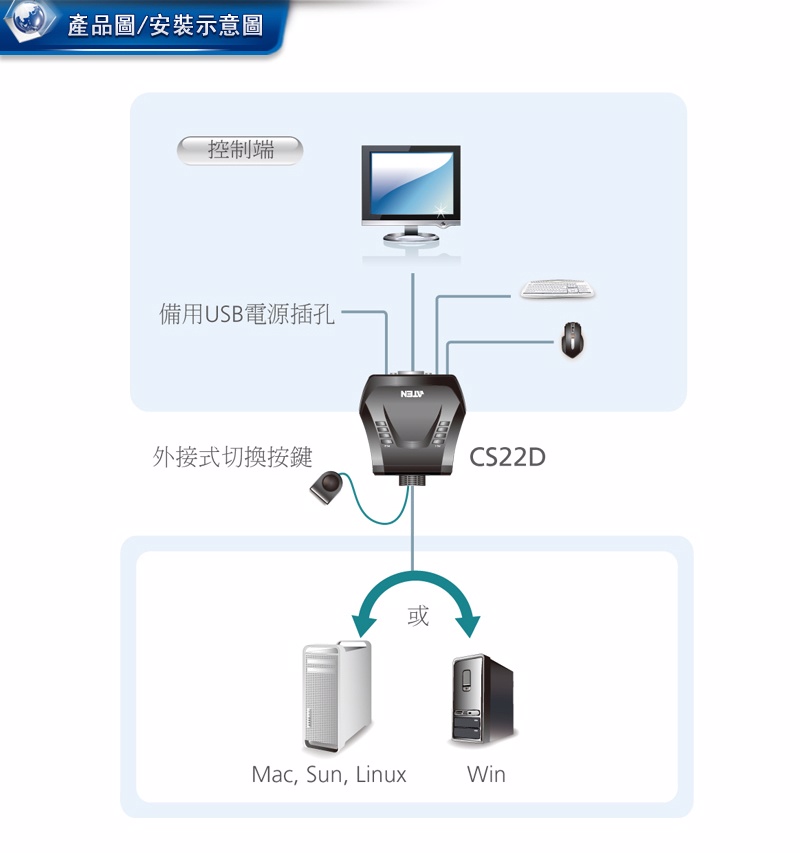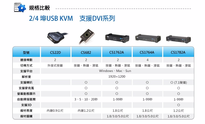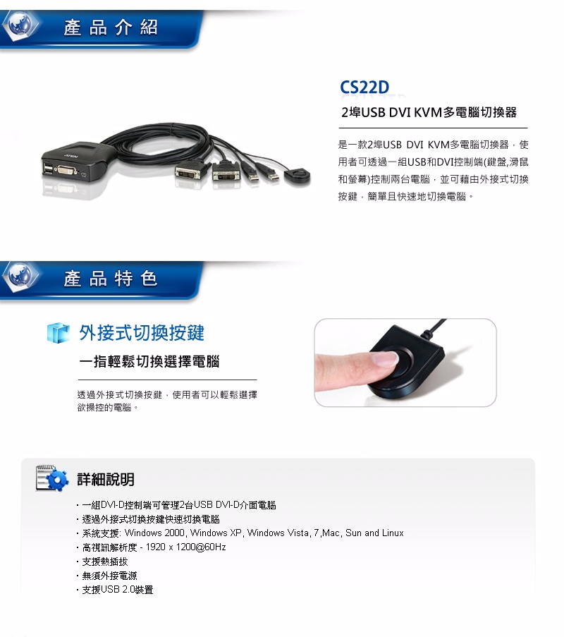 • ATEN CS22D【2埠-USB】DVI-D.外接式切換按鍵.支援多平台