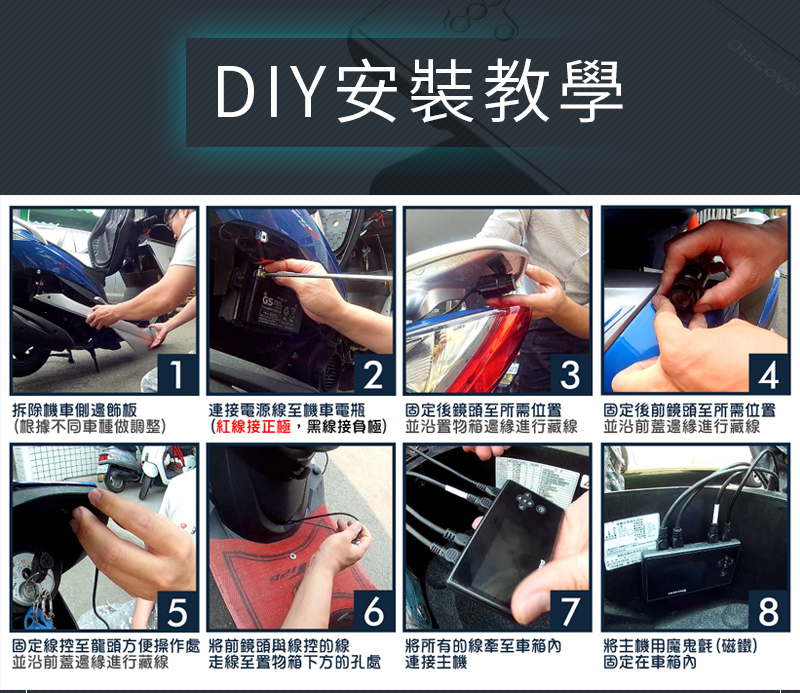 首創智慧感應 移動機車即刻開機錄影靜止三分鐘自動關機適合DIY族群及專業安裝防反接 過載 短路保護電瓶電壓過低停止錄影前後真正高清HD720P畫質(USB數位訊號)前後大廣角140度搜證無死角防水線控支援 錄影燈/麥克風/一鍵鎖檔最高支援128G記憶卡飛樂Discover「G1」機車記錄器 感應移動就錄影 kuso篇